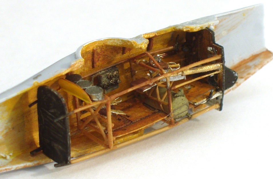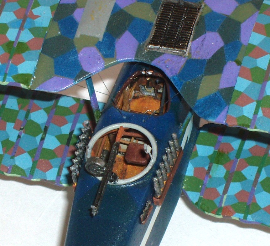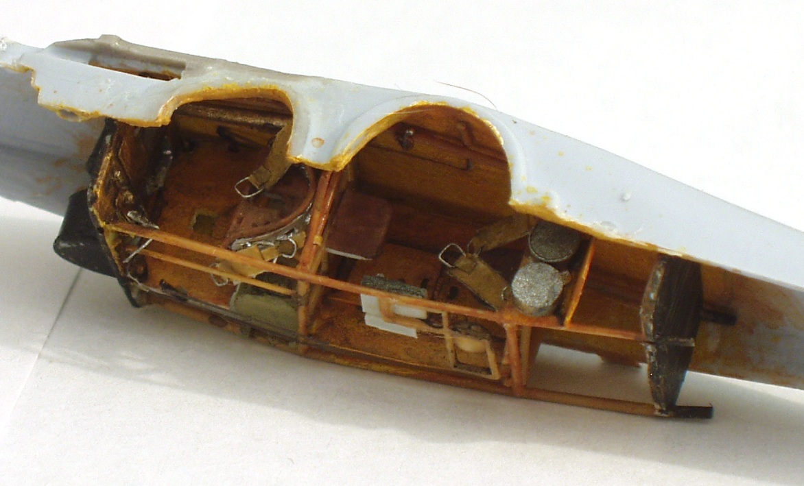 КАБИНА. Содержимое кокпита сделано из подручных материалов. Окрашен акрилом от Звезды и Тамии. Пулемёты из «закормов».