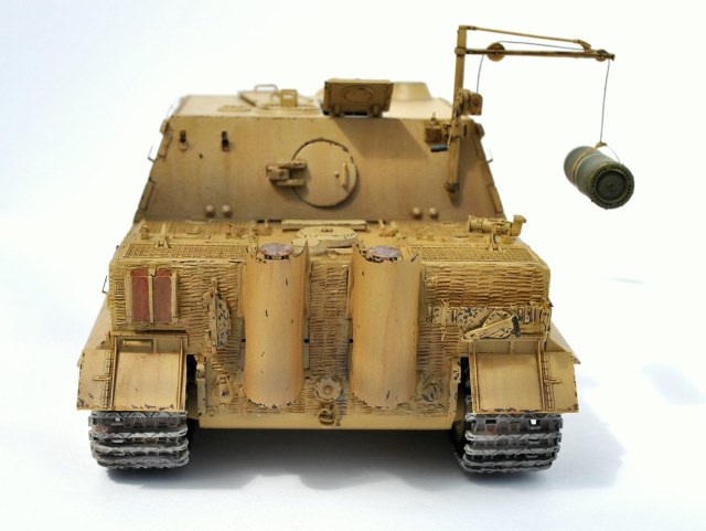 на кожухах глушаков изнутри сверху и снизу есть маленькая канавка, так вот по ней надо было продавить тонким тупым предметом, чтобы она выперла наружу (см. иструкцию и фото реальных тигров), травление не всегда уместно, например для крюков под запасные траки оно тонковато, надо было пластик оставить, только подточить немного, и ещё мало травлёную деталь срезать с платы, надо ещё и надфильком помахать, странная конструкция на краю огнетушителя, кажется что-то перепутано в травлении, по правому борту нет замков-лягушек (не давались с травлением или "потеряны экипажем"?)