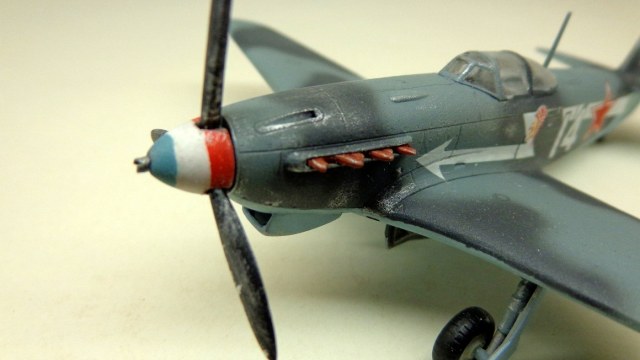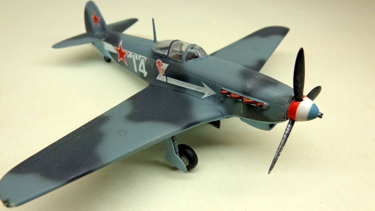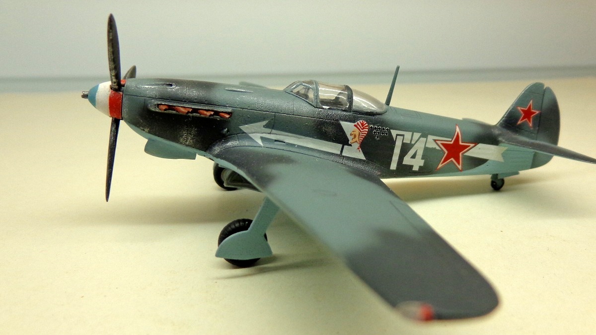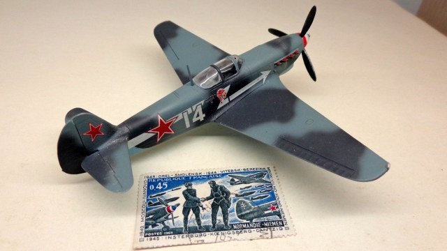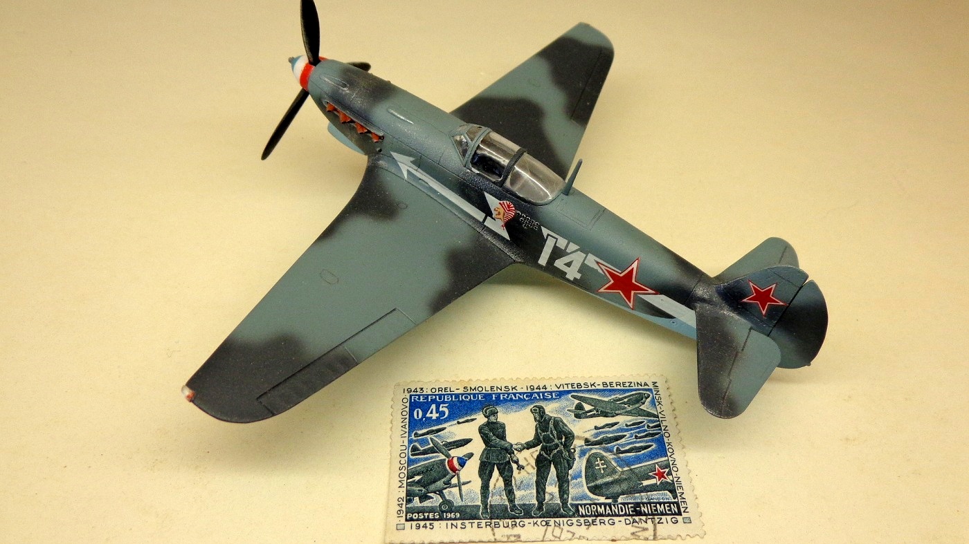 Как и многие мальчишки 60-х я собирал почтовые марки. К сожалению, от той детской коллекции осталось только несколько штук, в том числе вот эта - французская, посвященная "Нормандии-Неман". Летчик-француз, русский механик и самолеты ЯК-9. Судьбы летчиков этого авиаполка волнуют многих и сегодня. Поэтому когда возник вопрос какой делать модель Яка, было решено - конечно же "Нормандии". Модель от ДАКО была куплена очень давно, тогда же и склеена. Декаль "Travers" вообще из 90-х годов. И вот полтора года назад собрался все это закончить, после продолжительного перерыва в моделировании. Очень долго метался: какай же была машина Марселя Лефевра? Черно-зеленой или серо-голубой? Правда, в любом случае с расположением и формой пятен я наврал. Фото Марселя и его Яка нашлось с опозданием. Модель собрана, что называется из "каропки", без модных аксессуаров и технологий. Краски - "Звезда". Первый раз попробовал нарисовать камуфляж от руки, без масок. Ну вот пока и все. И самое главное - поздравляю всех "каропчан" с праздником, с ПОБЕДОЙ!!! P.S. Прошу извинить: первый опыт что-то фотографировать, печатать на компьютере, отправлять, редактировать.