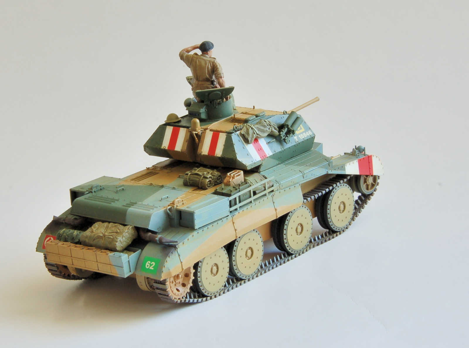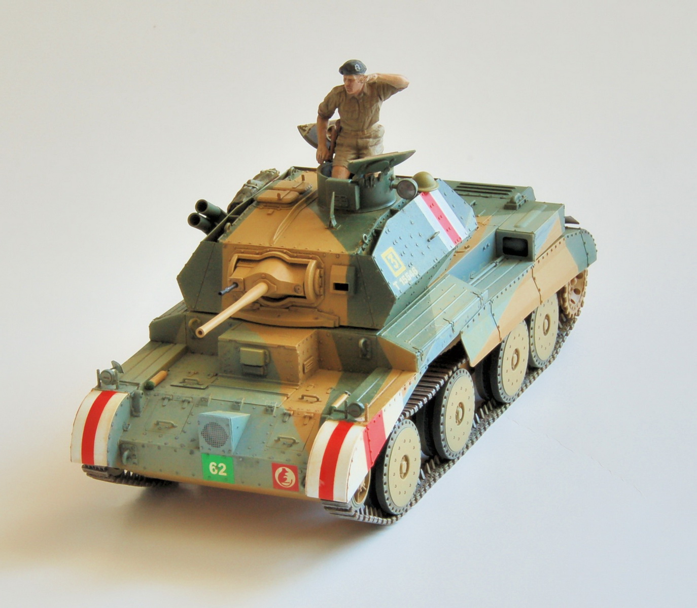 из предлагаемого Бронко вариантов декали, взял только зеленый квадрат АОС с цифрой 62. все полосы быстрого опознавания "белый-красный-белый" задул с помощью масок, номер военного ведомства(Т1....) и желтый квадрат (обозначающий 2 эскадрон) с номером взвода взял из декалей Италери, "крыса" из Тамии. вот такой вот винегрет)))