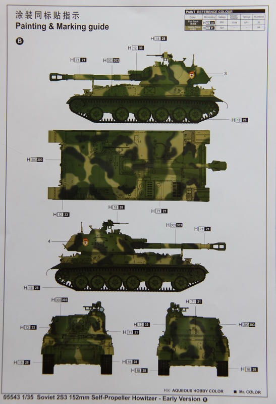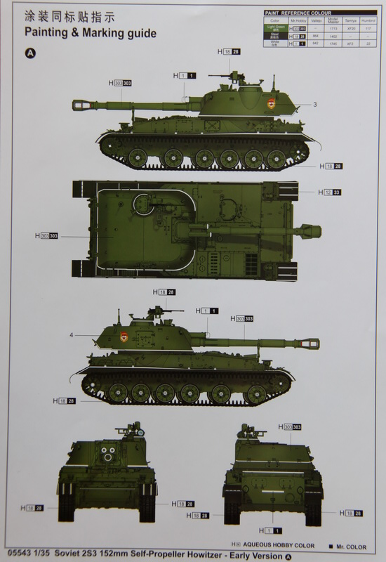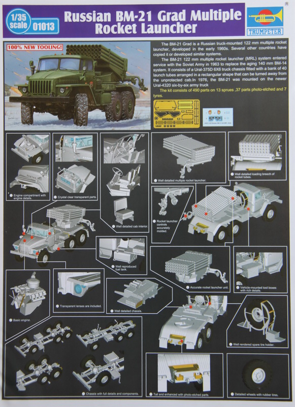 Плюс ко всему достаточно четкая (впрочем как всегда) инструкция и два листочка - один с рекламой модели БМ-21 "ГРАД" и рекламой новых наборов с фототравлением, второй листок - схема окрашивания в двух вариантах - парадном и камуфлированном.