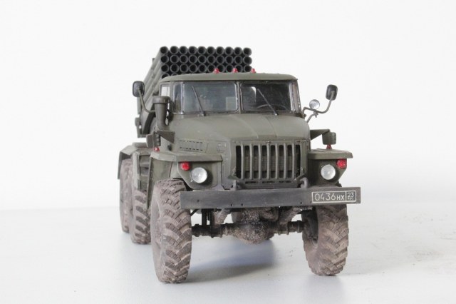 На воздухозаборнике огромный шов. На шинах тоже по центру протектора швы надо удалять. Брызговики как бронеплиты, надо было их как нибудь помять, уголки загнуть. Почему поворотники красные? Зачем Граду знак автопоезда? Где задний номер? Смывки то ли вообще нет, то ли ее не видно.