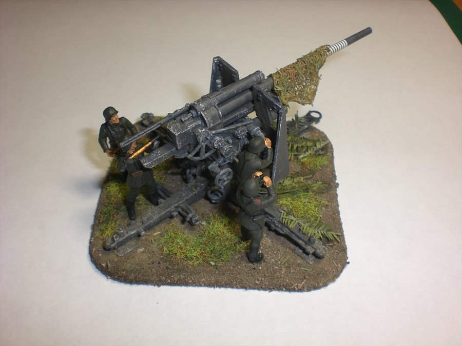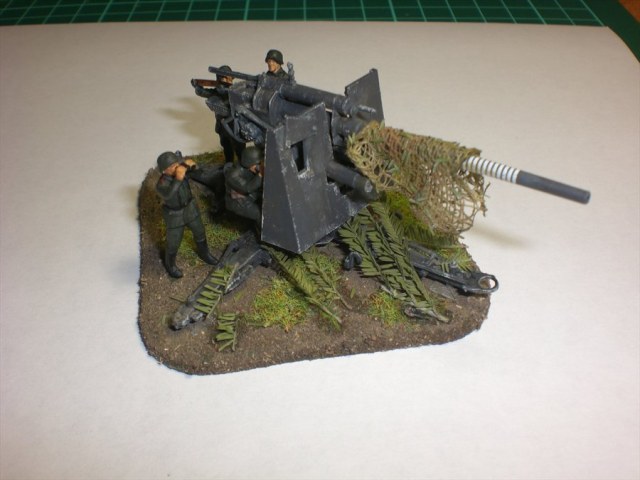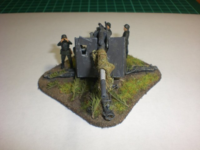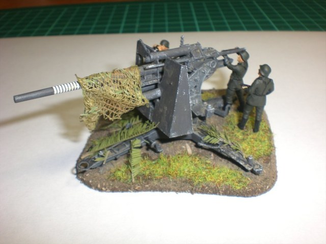 У фигур излишний блеск, который можно оставить на сапогах и касках. Сколы на зенитке создают впечатление, как будто она алюминиевая. Ветки пальмы приводят к выводу, что это Африка , но тогда надо было красить в Африканский цвет, да и форма одежды у расчета будет не соответствовать. Кстати ветки очень реалистичны, хотелось бы знать из чего они?