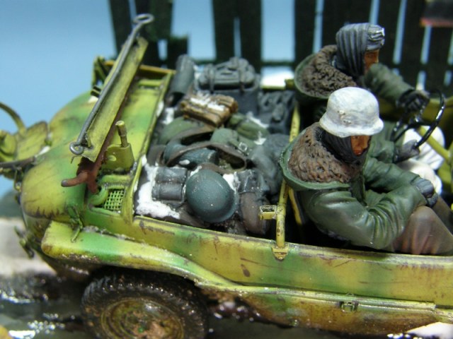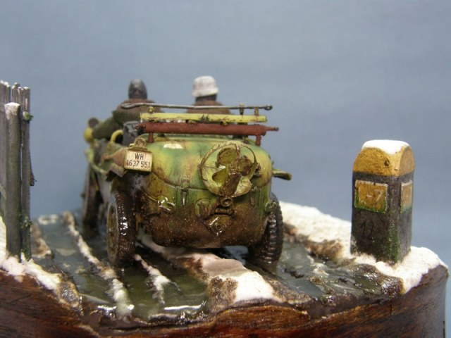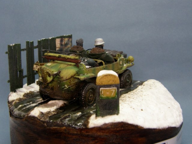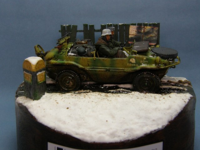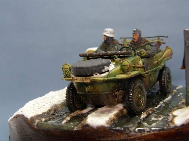 Это уже моя третья виньетка. Швиммваген от Тамии дополнен травлением от Эдуарда и обвесом от BlackDog, первый опыт с камо, красил акрилом Vallejo, использовал химию от АК-interactiv. Экипаж от Evolution Miniatures окрашен темперой. Забор из шпона, вода в колее эпоксидка с добавлением акрила нужного оттенка, после засыхания, прошелся глянцевым лаком по колеям и низу машинки. Снег сода + ПВА.