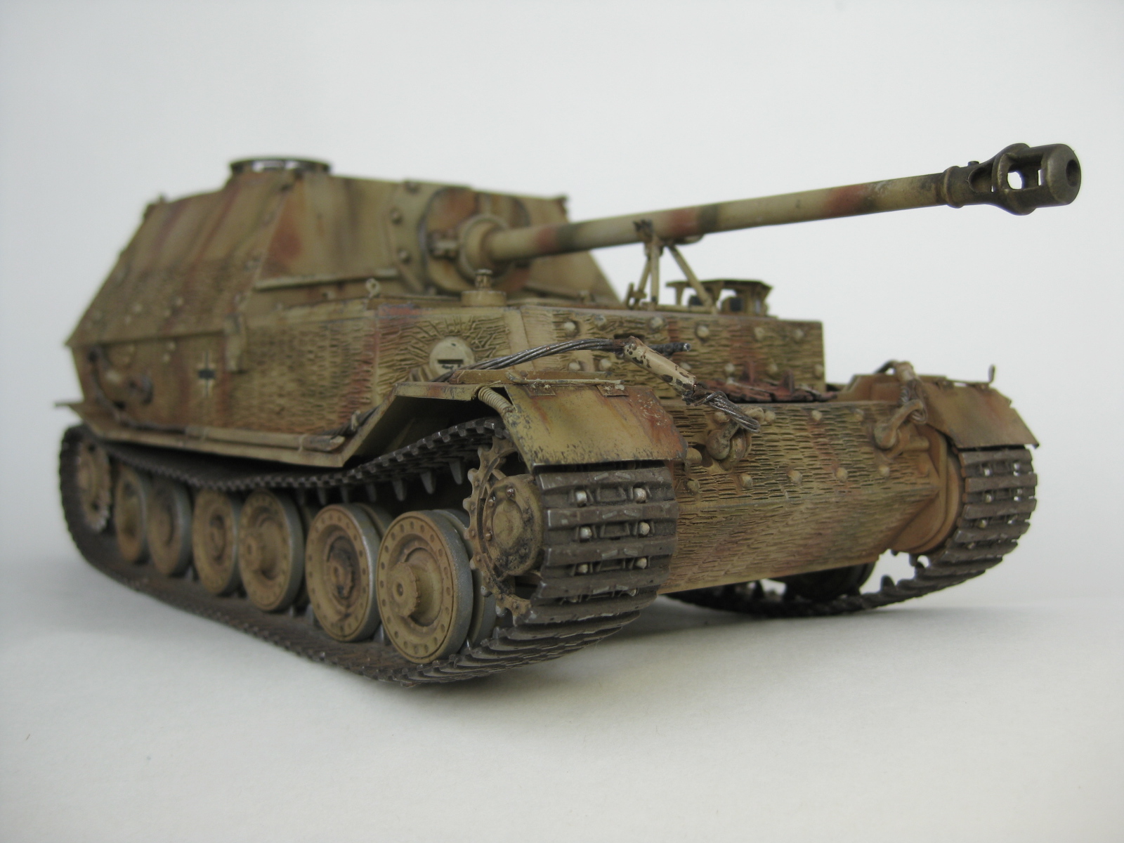 Здравствуйте.Представляю вам модель этой известной сау.Сама модель довольно старая и описывать ее нету смысла.В двух словах опишу процесс посройки и окраски. Значительных переделок не было.Сразу переделал надгусиничную полку,она выполнена из метала-пергамента,из него же изготовил ящик зип,мелкие ручки и крючки.Заново изготовил инструмет,немного доработал домкрат,сделал под него чурбак.Трос-переплетенная проволка.Были немного доработаны перескопы.Цемеррит наносил паяльником. Базавый цвет- автомобильная эмаль,камуфляж-акрил от звезды.Фильтр,смывка и подтеки грязи и ржавчина-художественное масло.Сколы и высветление-акрил.После модель была задута матовым лаком.Вконце немного припылил ходовую пастелью и сделал подтеки гсм. Что получилось судить вам.