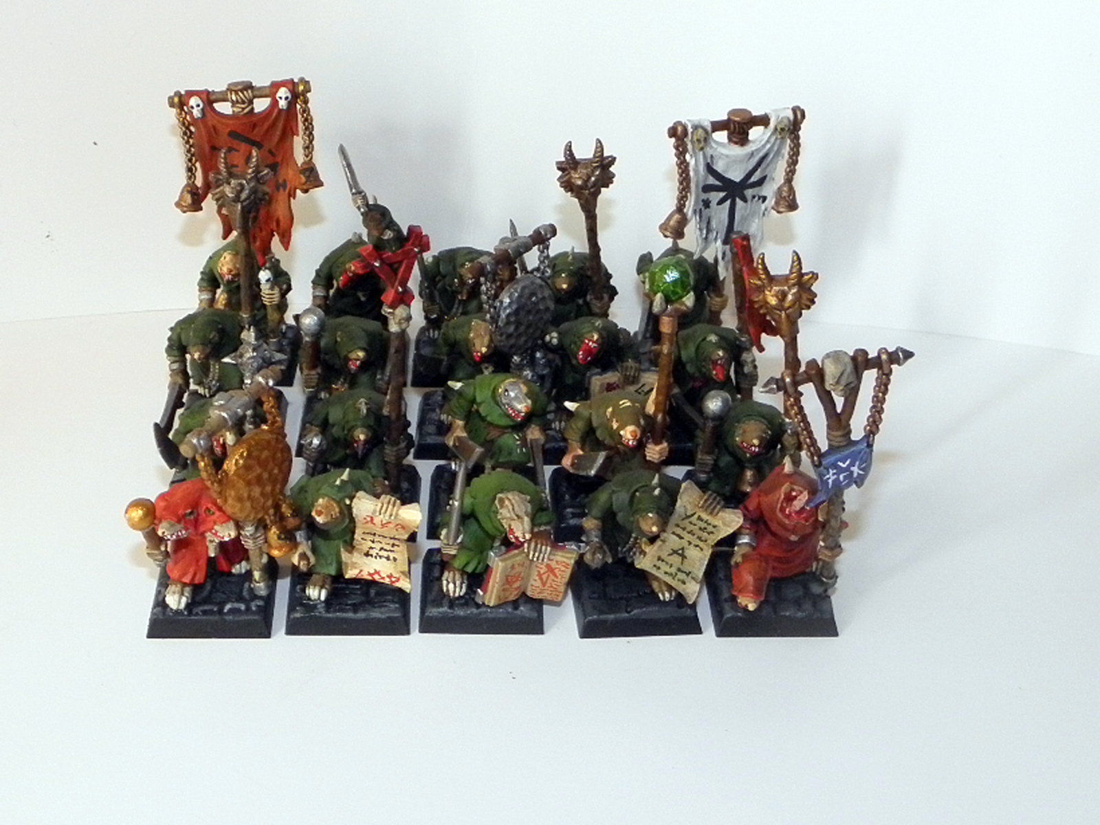 Собираясь вместе, чумные монахи зачитывают отрывки из нечестивой Книги Скорби, снова и снова повторяя писклявыми голосами Обряд Заражения или Литургус Инфектус. Собираясь в бой, чумные монахи идут, воодушевляемые одним из знамён Клана Чумы – часто это просто почти разложившееся тряпьё на древке, покрытое невыразимыми искривлёнными рисунками, намалёванными краской, полученной путём соединения варп-камня с кровью.