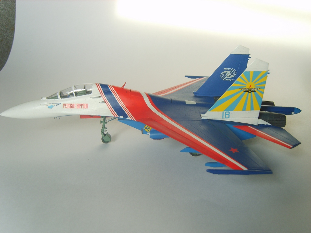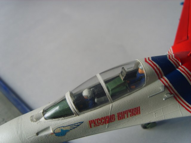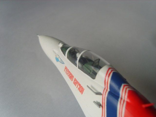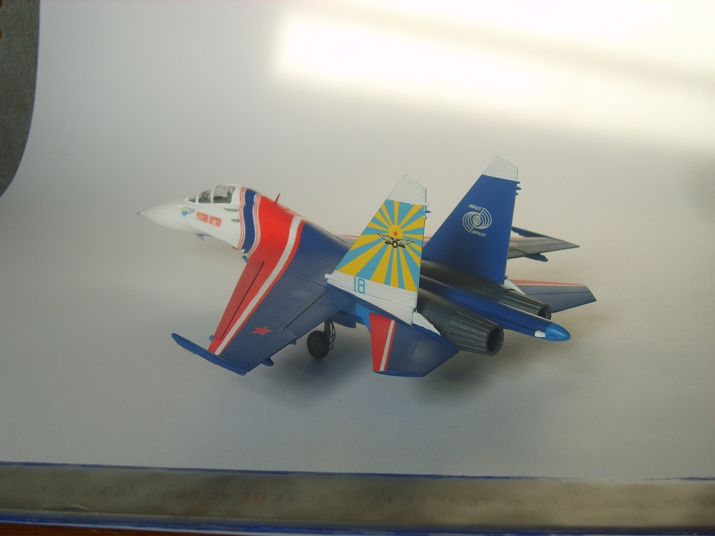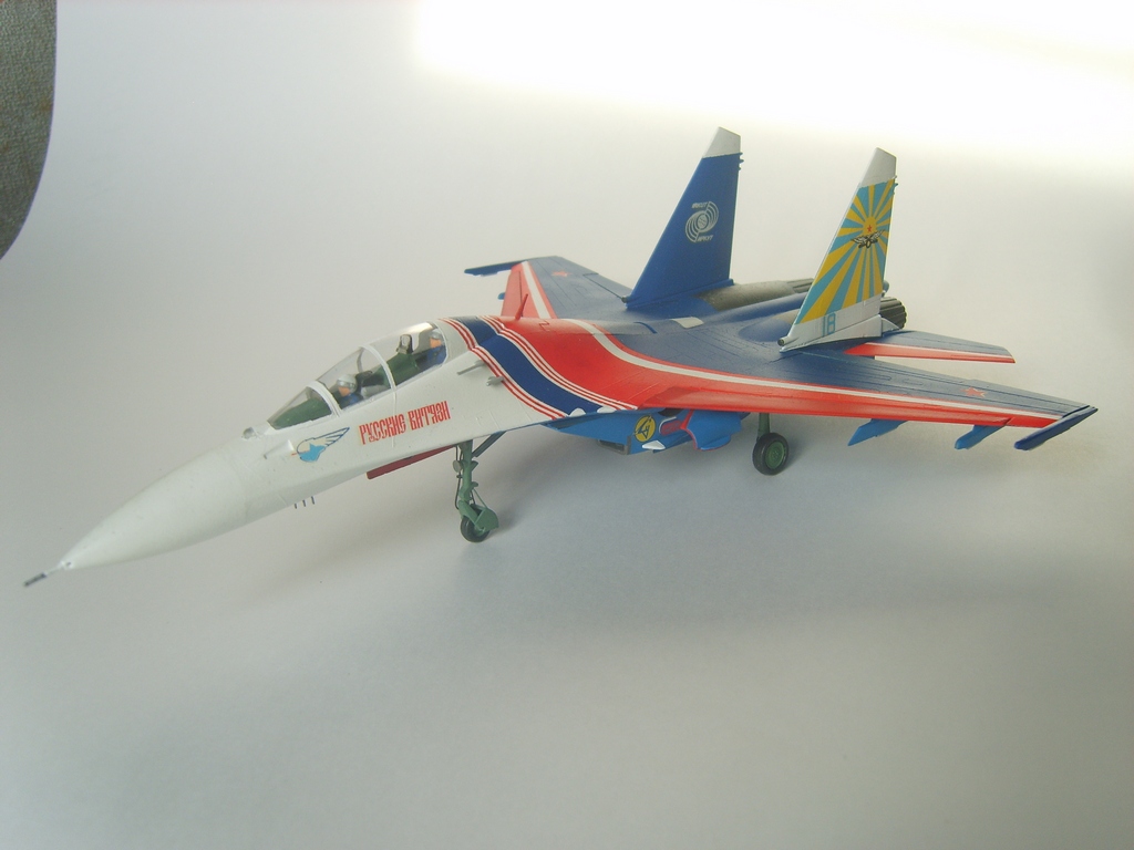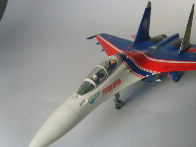 Добротная аккуратная сборка. Пластик конечно ужасный, ибо это Звезда, но, как мне кажется вам удалось "вытянуть" модель за счёт аккуратной сборки и покраски! Из придиризмов: голубой цвет внутренних поверхностей килей должен быть таким же как и голубой низ самолёта. А стойки шасси должны быть серого цвета. Но, в целом мне понравилась модель. На этом борту 16 августа 2009 года совершил свой последний полёт гвардии полковник Игорь Валентинович Ткаченко - командир Витязей. Катастрофа произошла во время репетиционного полёта перед авиасалоном МАКС. Добрая память...