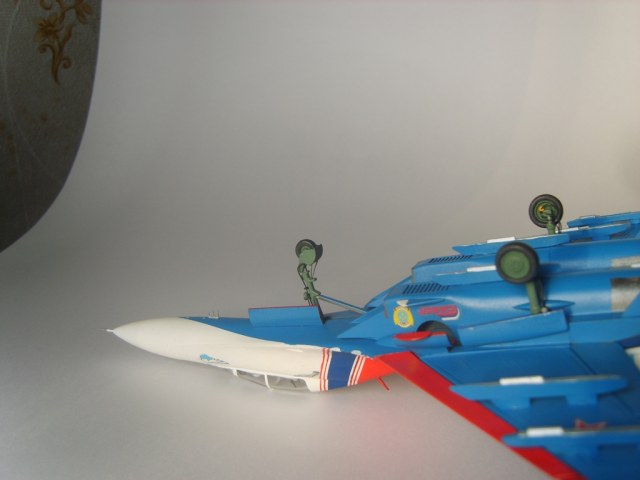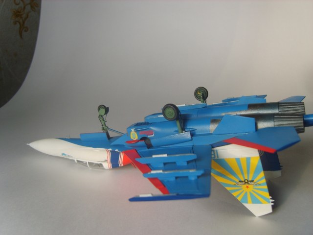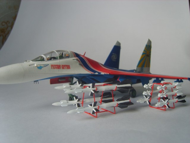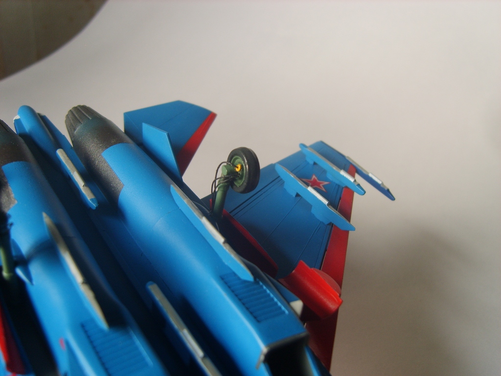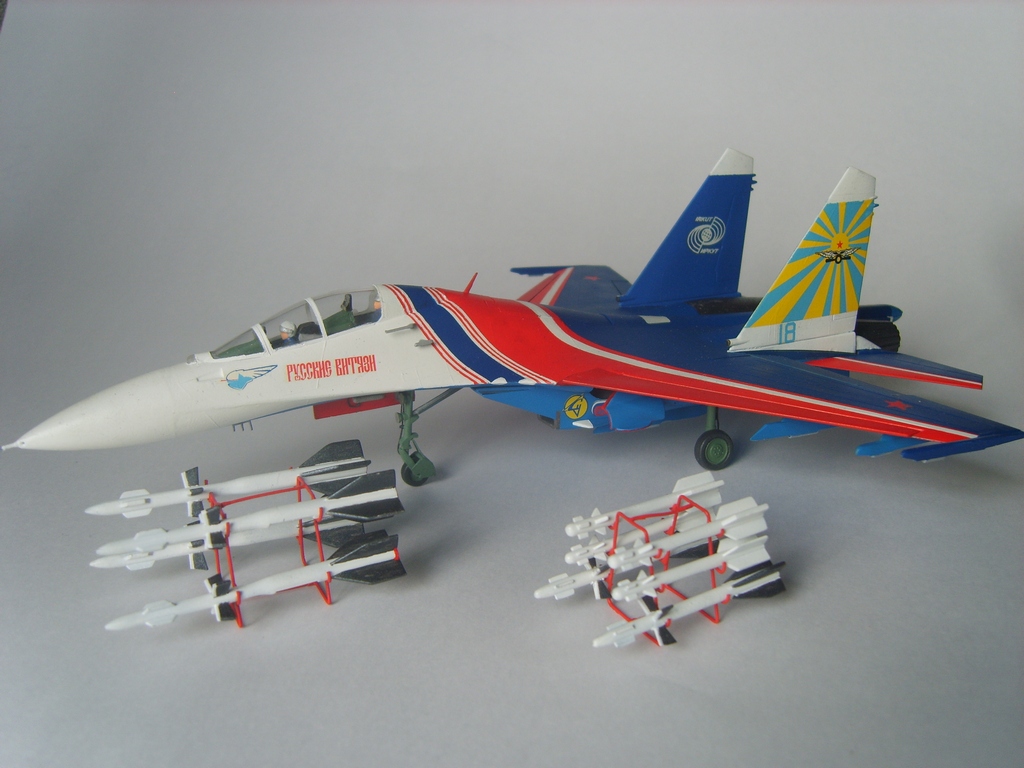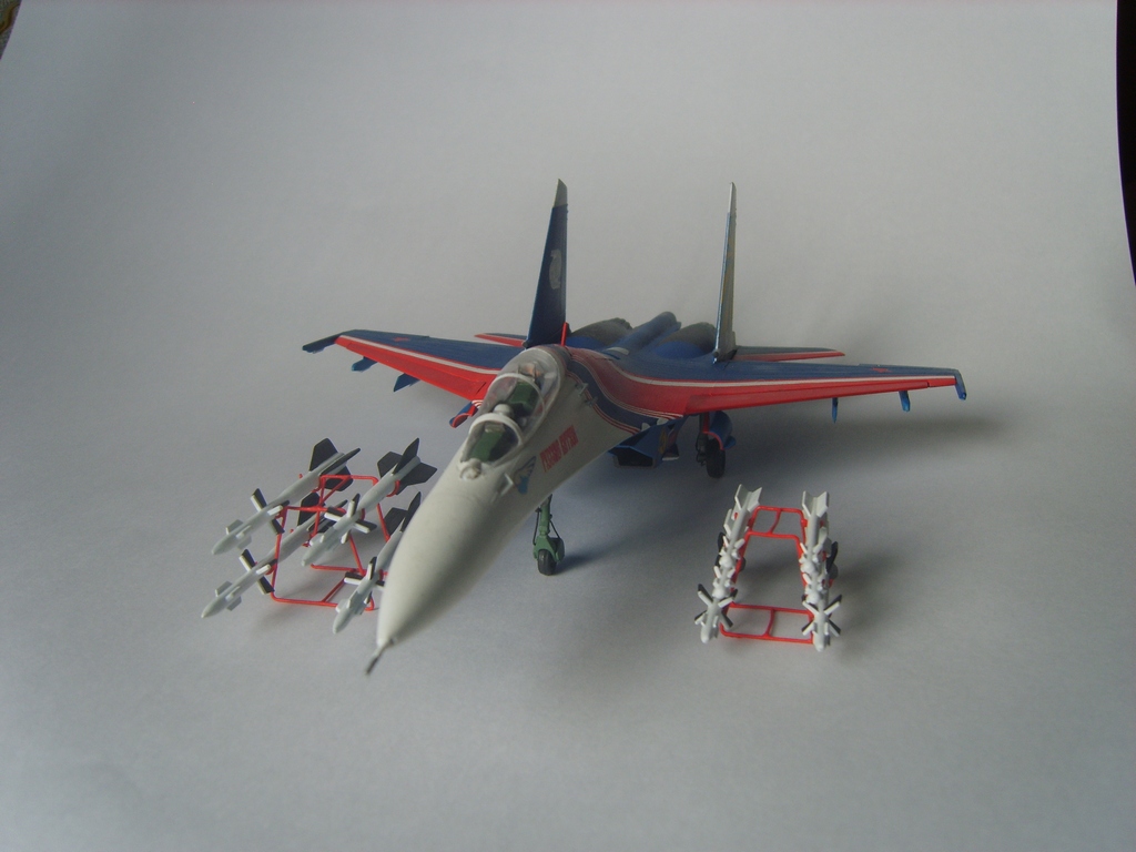 Добротная аккуратная сборка. Пластик конечно ужасный, ибо это Звезда, но, как мне кажется вам удалось "вытянуть" модель за счёт аккуратной сборки и покраски! Из придиризмов: голубой цвет внутренних поверхностей килей должен быть таким же как и голубой низ самолёта. А стойки шасси должны быть серого цвета. Но, в целом мне понравилась модель. На этом борту 16 августа 2009 года совершил свой последний полёт гвардии полковник Игорь Валентинович Ткаченко - командир Витязей. Катастрофа произошла во время репетиционного полёта перед авиасалоном МАКС. Добрая память...