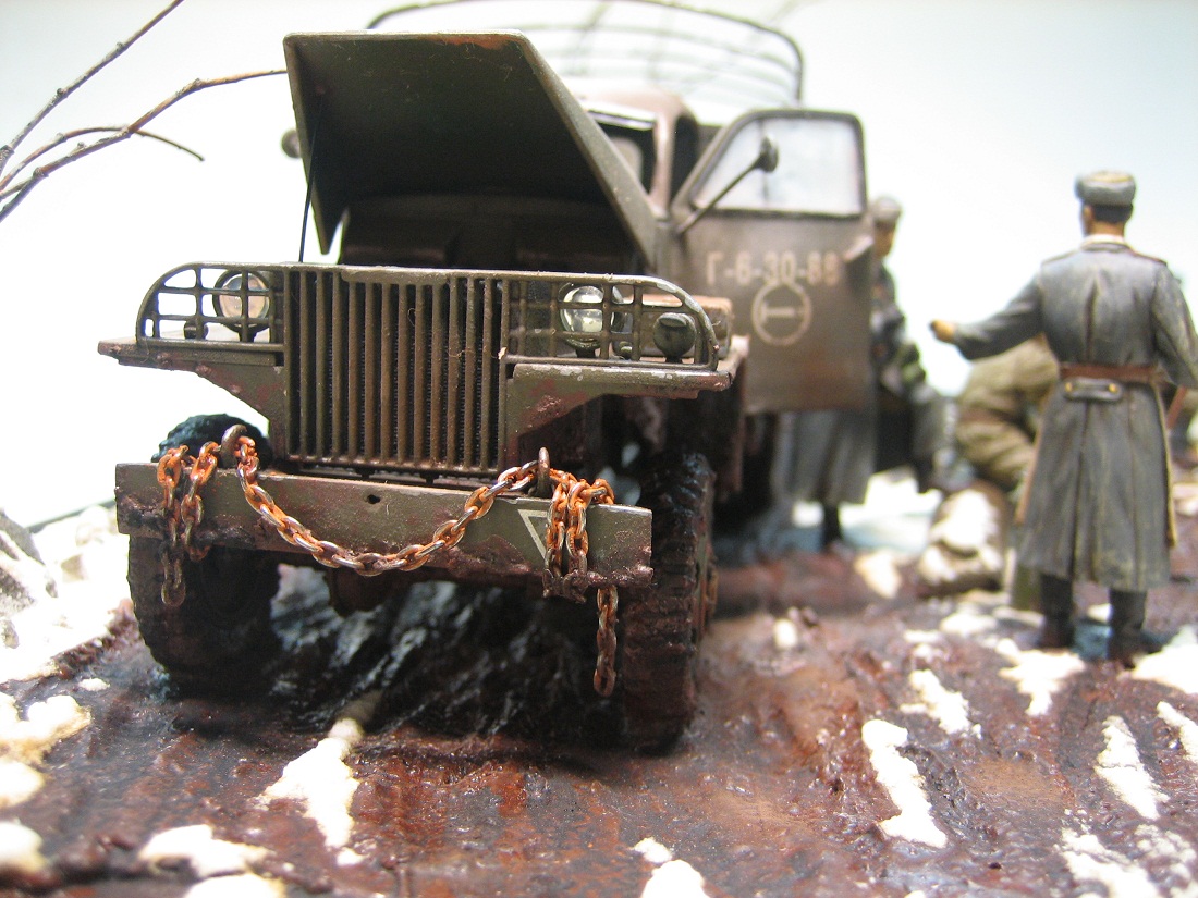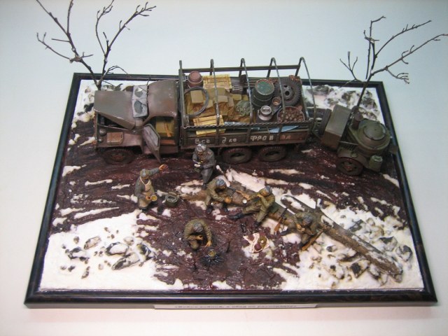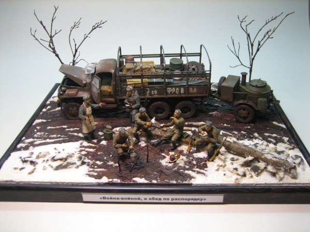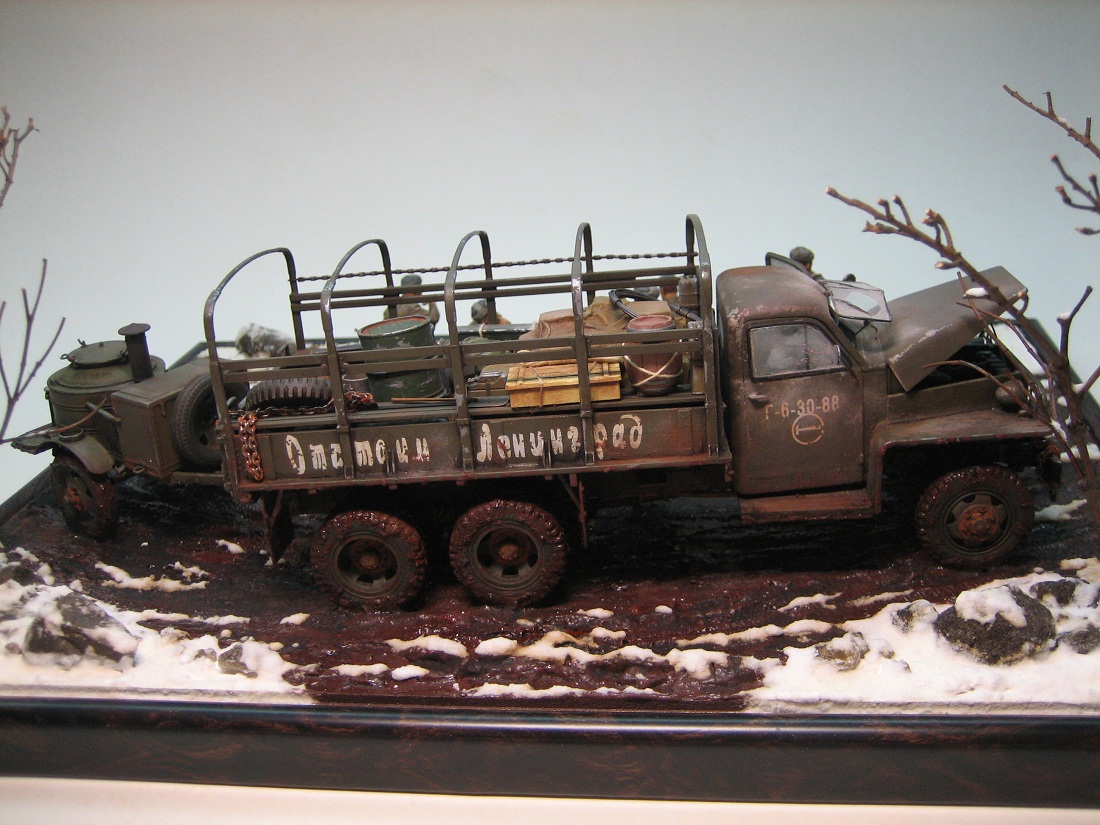 Стоит принять за должное усилия автора по постройке диораммы,но есть некоторые вопросы по сюжету.Почему на кузове нет тента,(ведь распутица,дождики) и так всё там чистенько? Для чего приехал Студер с кухней,ведь у них уже что-то варится в котелке!? И как я понял - разливаются наркомовские,что несовместимо для данной обстановки. Для такого количества солдат офицер не уместен,достаточно сержанта или старшины.Количество стрелкового оружия не соответствует количеству солдат,и почему такой разнобой? ППШ в основном выдавались штурмовым группам или использовались взводами,ротами и пр. на передовой(это уже субъективно),тыловикам достаточно карабинов(винтовок).И чего они в грязь-то залезли,посуше места нет? Я не уверен,что Студеры в то время использовались под Ленинградом(судя по погонам-или весна-осень 1943г,или весна 44г,но тогда Ленинград уже освободили),уместнее ЗиС.Это чисто моё мнение,которое совсем необязательно должно совпадать с мнением автора.А общее восприятие композиции вполне приемлемое,дальнейших успехов!