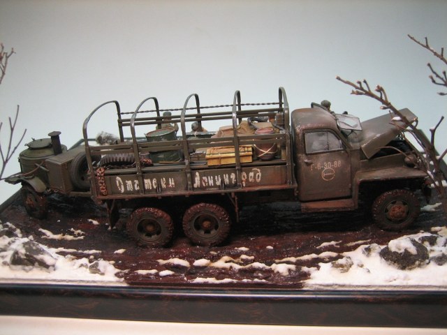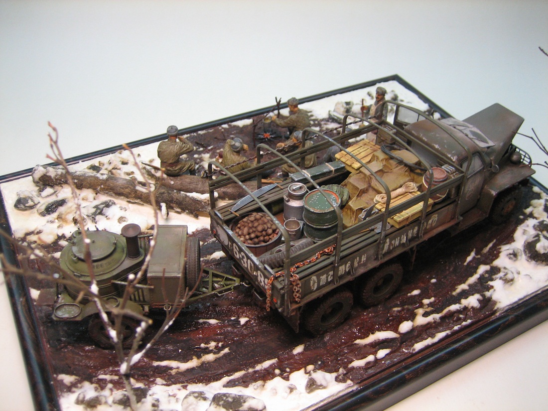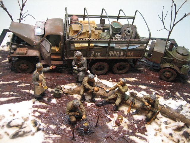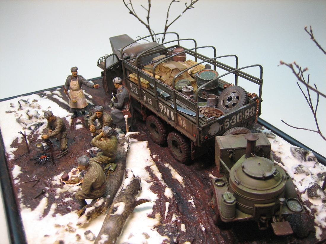 Когда подразделение выполняет работы повзводно/поотделенно, никто ни в какое расположение не возит. Может, вся рота на трассировке или рекогносцировке, сколько надо машин? Другой вариант - отделение (расчет) несет службу (выполняет работу) в интересах другой роты, паек выделяется в эту роту. В общем, здесь наезд совершенно не по делу, миллион случаев для доставки горячего питания к подразделению. По композиции у меня единственное замечание - это костер в грязи. Снег растаял - не катит, под растаявшим снегом почва высохла бы, а здесь явно повсеместная грязь из-за теплой погоды. А так - респект, классная диорама.