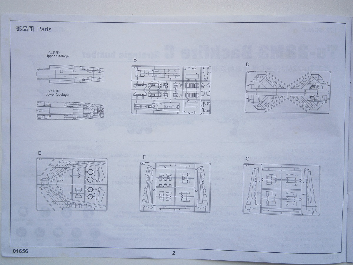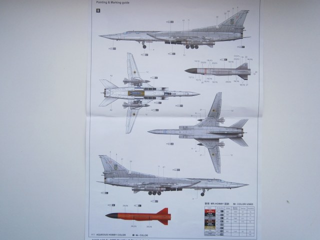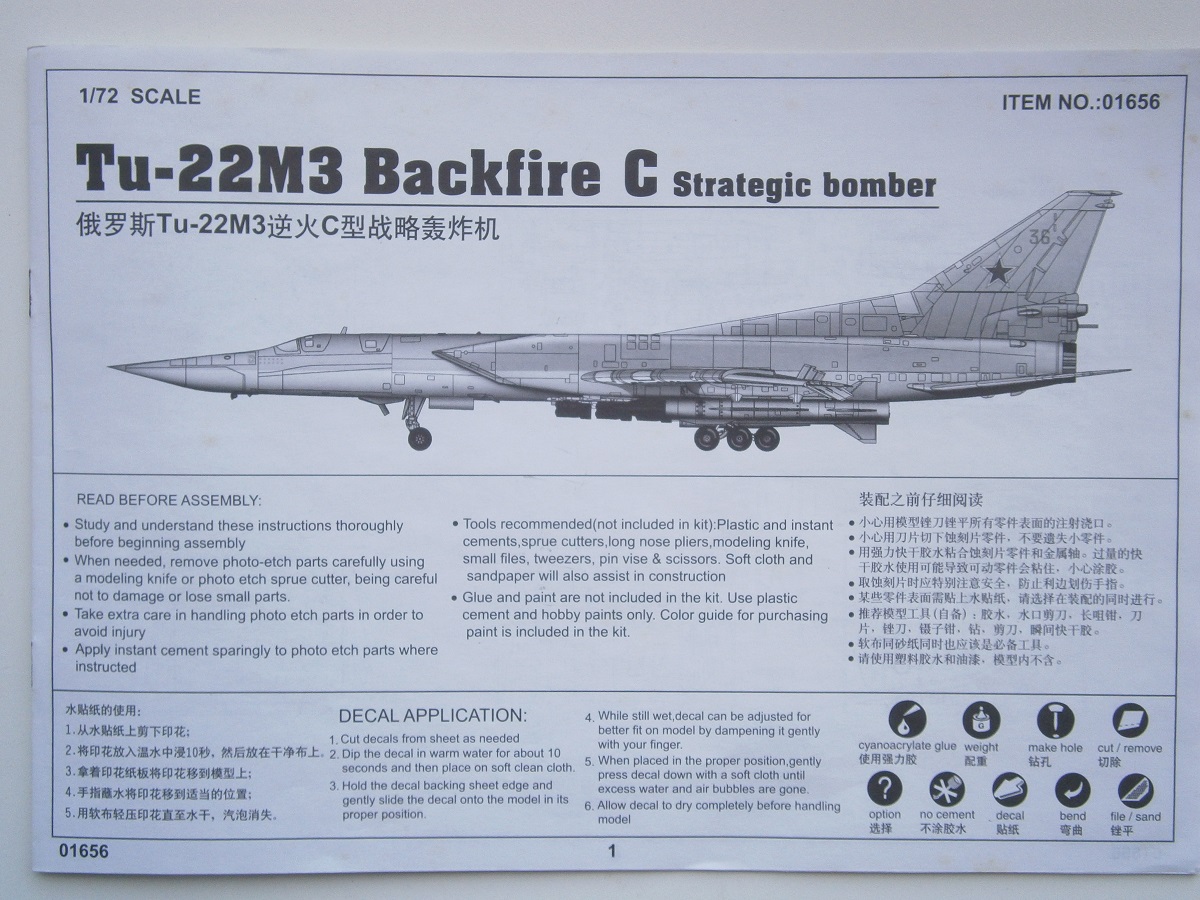 Приветствую Всех и доброго времени суток уважаемые коллеги по цеху !!! Предлагаю Вашему вниманию обзор стратегического бомбардировщика Российских ВВС ТУ-22М3, от Китайского производителя TRUMPETER представленную в 1/72 -м масштабе. В красочной картонной каробке находится шеснадцать литников с деталями светло-серого цвета , и один литник из прозрачного пластика остекление кабины пилотов . Все литники с деталями упакованы в полиэтиленовые пакеты . Инструкция выполнена в форме книжки, на белых листах, читается отлично и все понятно . Также в каробку вложен цветной глянцевый лист с окраской данного самолета , предлагается два варианта выполнения данной модели самолета : 1). ВВС РОССИИ б/н № 36 , 2). ВВС Украины б/н № 57. Деколь также предлагается на два варианта, хорошего качества , имеет не много технички, но она слабовата,думаю приобрести от Authentic Decals. Теперь хотелось бы вернутся к содержимому набора, и рассмотреть качество и деталлировку !!! Детали хорошего качества, имеют довольно хороший не глубокий но четкий крой, большое количество технологических и эксплуатационных лючков, и заклепочных швов ,что очень порадовало. Кабина пилотов имеет слабую деталировку , приборная доска представлена на деколи. Кресла пилотов слабые в деталировке, их можно заменить на смолу. Ниши шасси детализированы не плохо, имеют проводку гидравлики и топливопровод. Стойки шасси порадовали, хорошо детализированы ,также имеют проводку. Колеса шасси слабоваты, их можно заменить на резиновые от ЭКИПАЖ . Сопло двигателей не плохие, но их нужно доработать, углубить крой и поправить крепеж на гибких элементах выходного сопла. А если есть возможность то применить фототравление. В целом набор мне очень понравился,давно о нем мечтал.Желаю удачи Всем !!! С уважением Дмитрий !!!