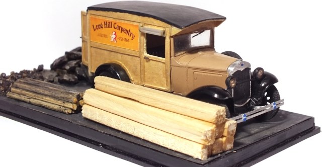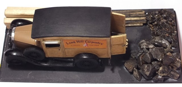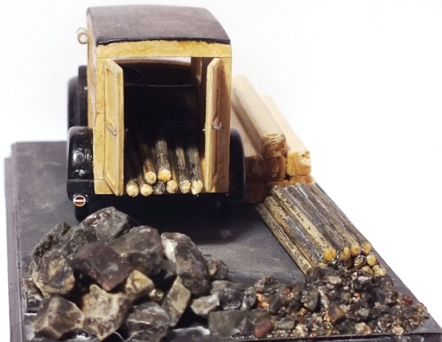 Подставка - стандартный бокс от модели , камни- камни , брусья - деревянные шампуры, столбики в кузове -шампуры , но круглые.