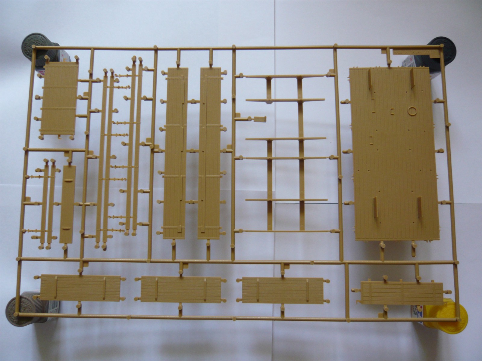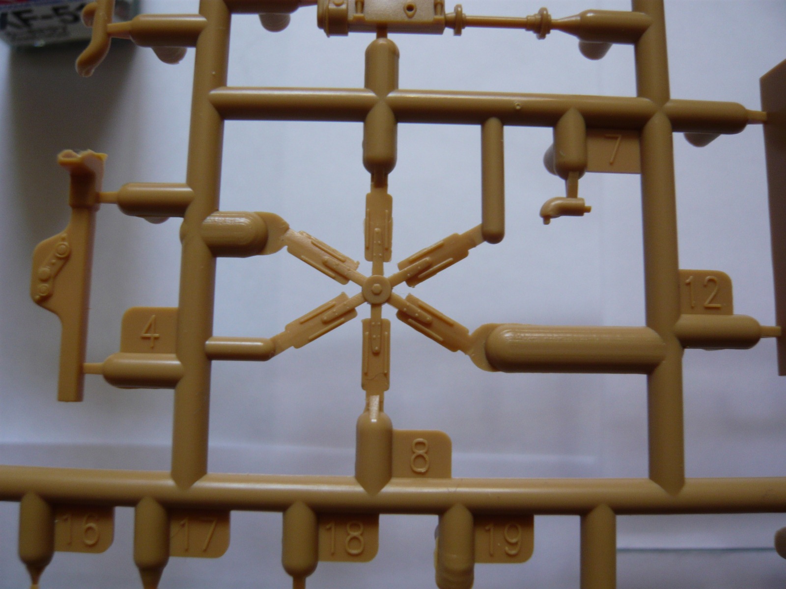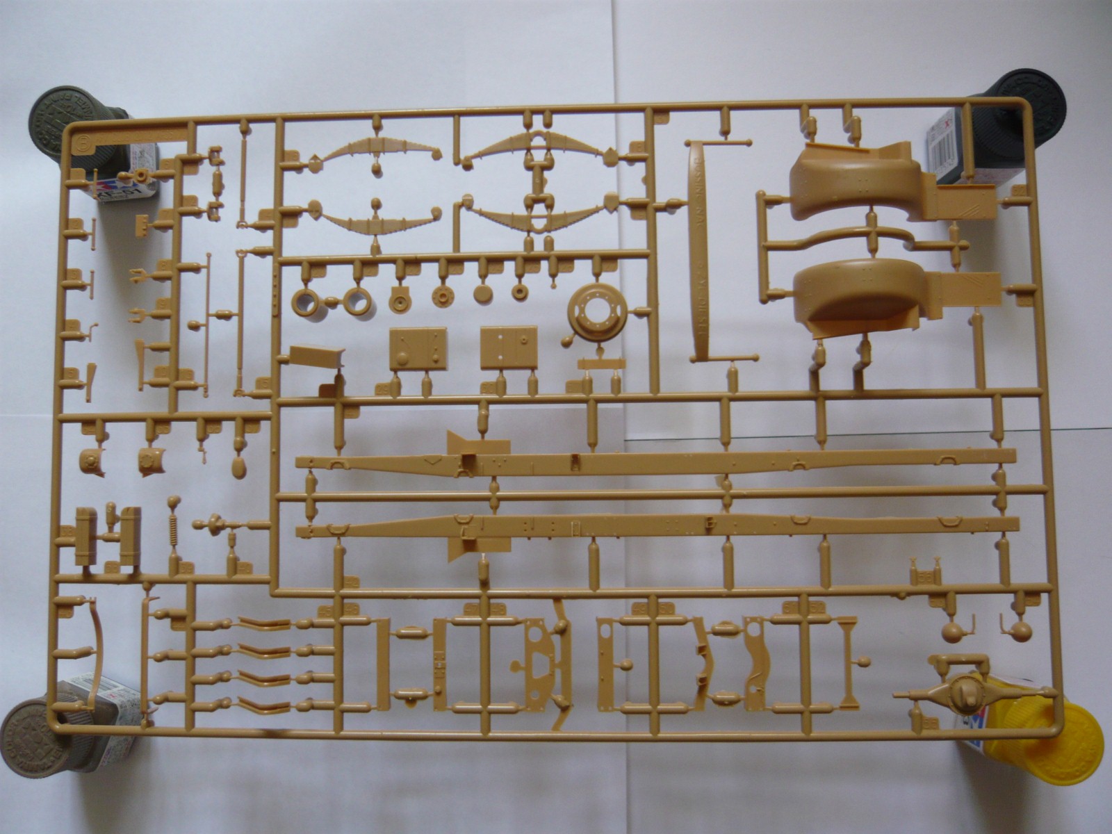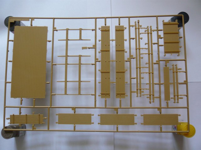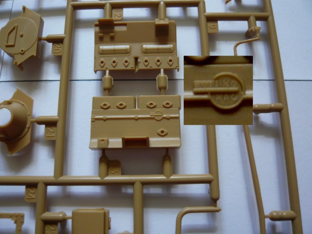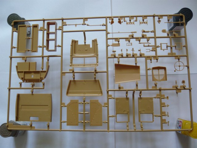 Внутри: 7 литников с деталями, все в пакетах, среди них один со стеклом, инструкция, листочек с картинкой как на крышке, декаль, травло и колеса. Литье на "5" идет с натяжкой: стыки прессформ хоть и без смещений, но облой порою имеют. Стыковка четкая, посадочные места везде указаны. Толкатели на внутренних поверхностях преимущественно, нормально.