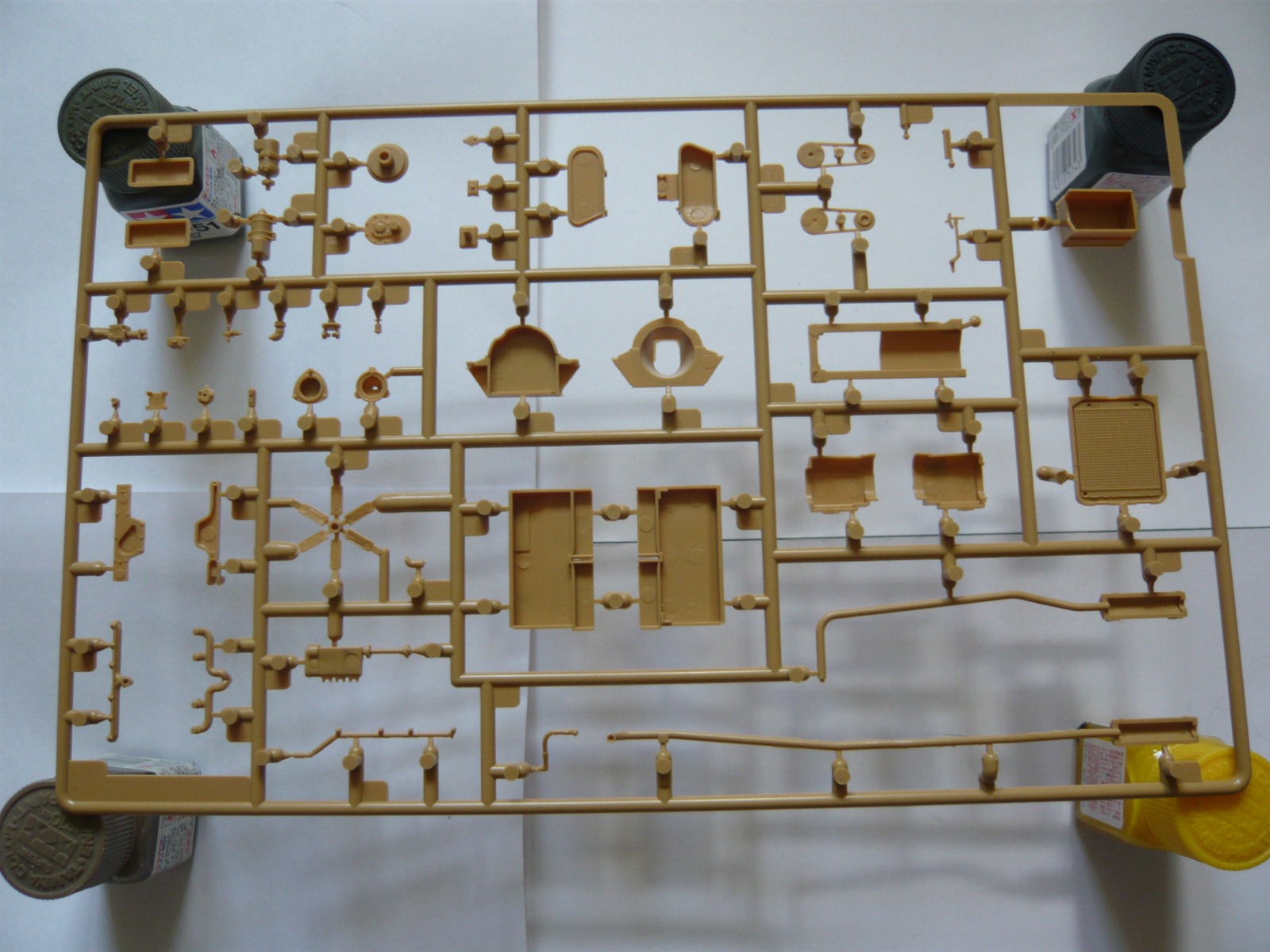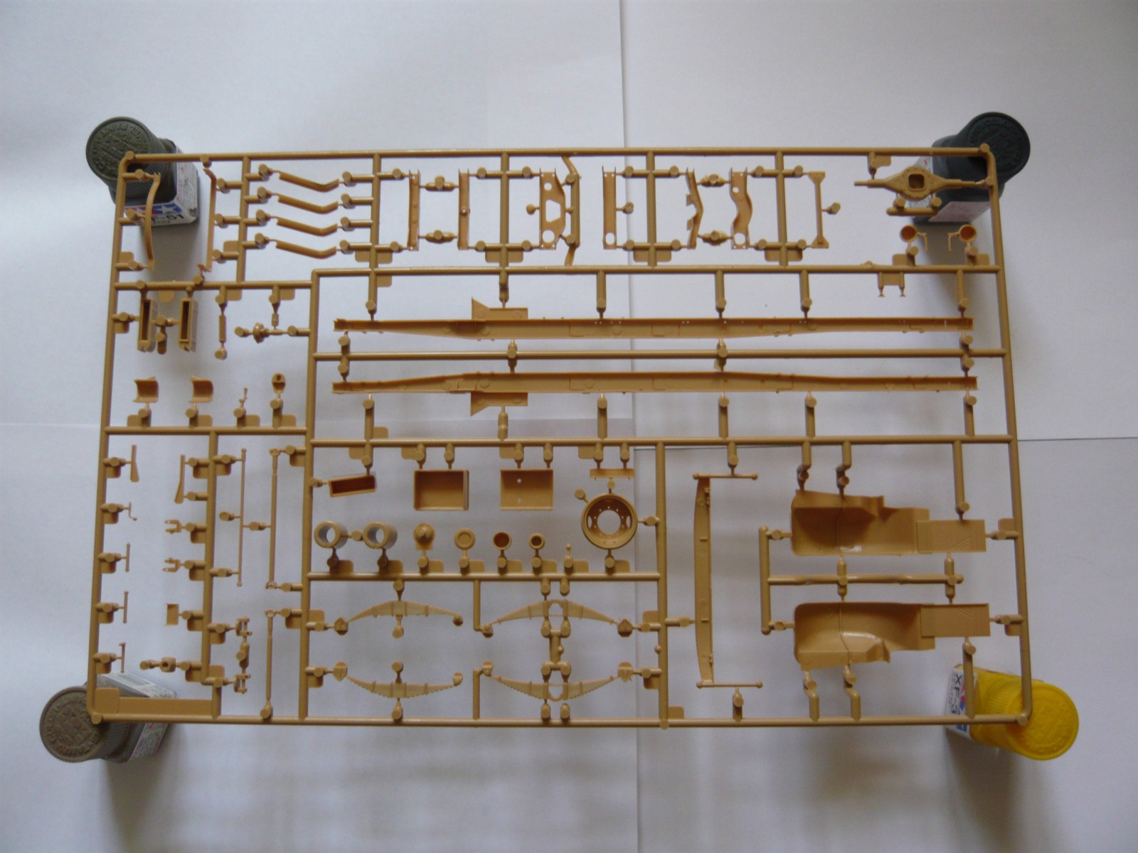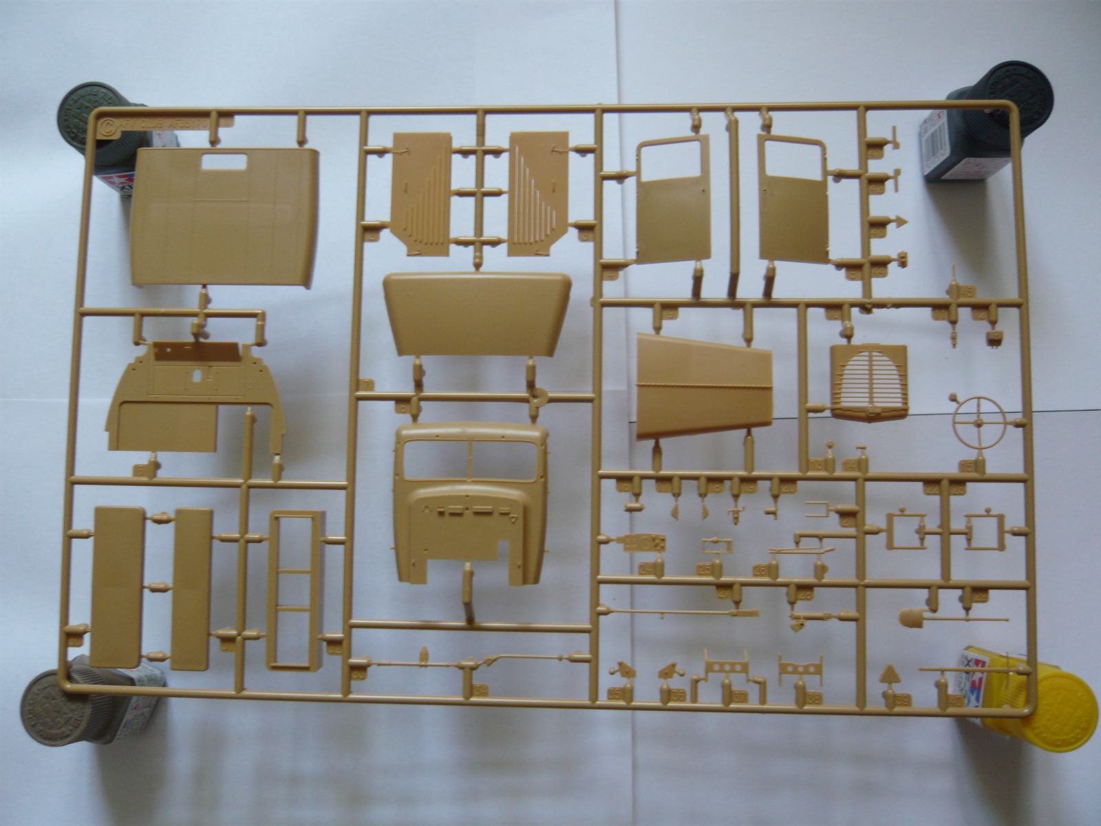 Внутри: 7 литников с деталями, все в пакетах, среди них один со стеклом, инструкция, листочек с картинкой как на крышке, декаль, травло и колеса. Литье на "5" идет с натяжкой: стыки прессформ хоть и без смещений, но облой порою имеют. Стыковка четкая, посадочные места везде указаны. Толкатели на внутренних поверхностях преимущественно, нормально.