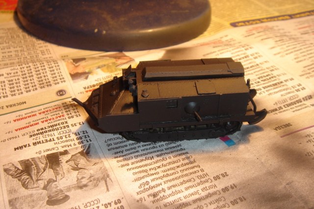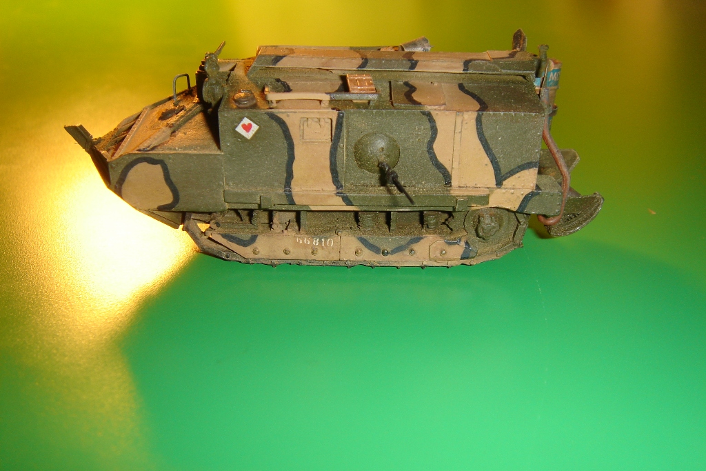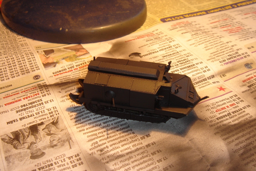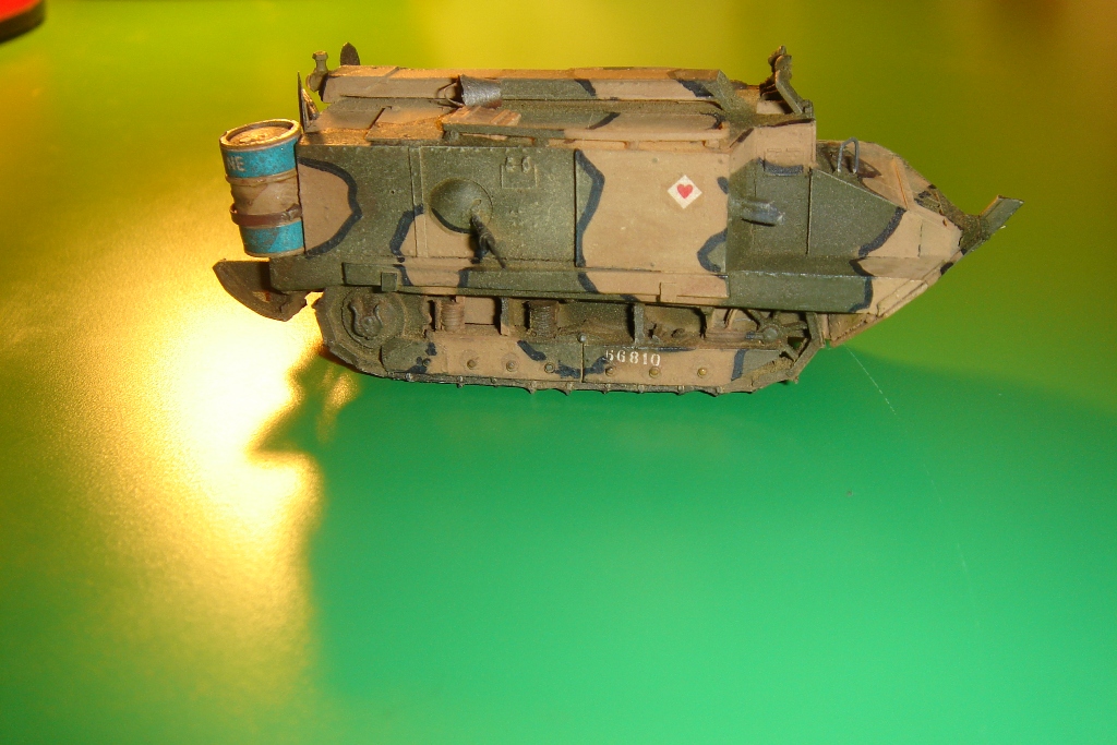 Багажники, ведра, пулеметы, фара ацетиленовая задняя, лопаты, рамка прицела. Это все самодел. Из готового бочка, ящики, фара Эльф. Это моя первая смоляная модель. По качеству сказать затрудняюсь. Из приложенной фотографии видно, на что ориентировался. Цели попасть не было. Потому, что не нашел бы декалии с покрасом сложно разобраться. Моего знания французкого не хватило, чтобы прочитать, что написано внизу бочки. На французком форуме, где обсуждали этото танк тоже нет инфы. Кто знает подскажите - интересно. Я написал мир. Может так?