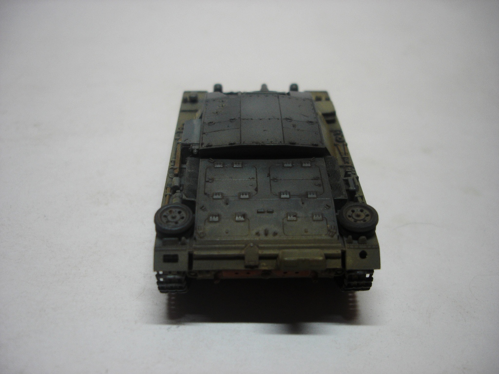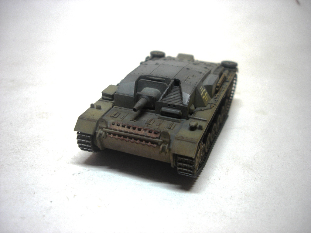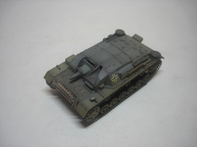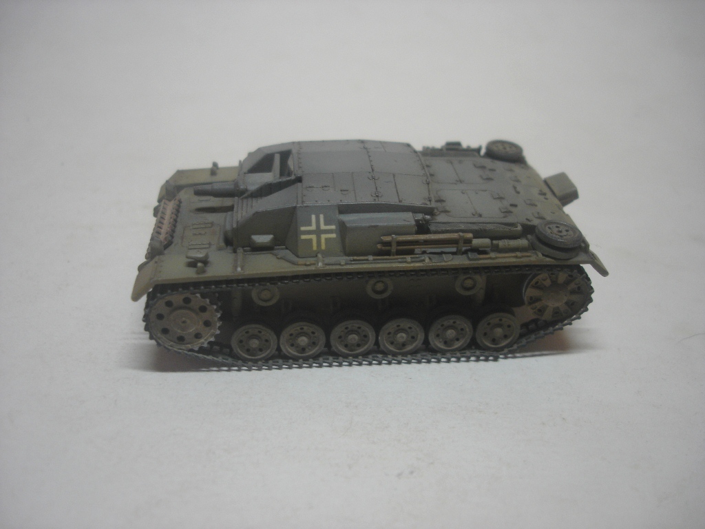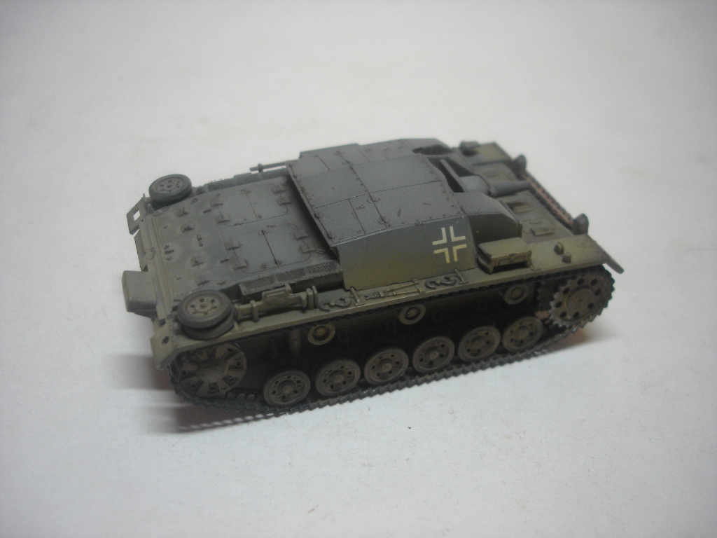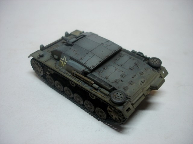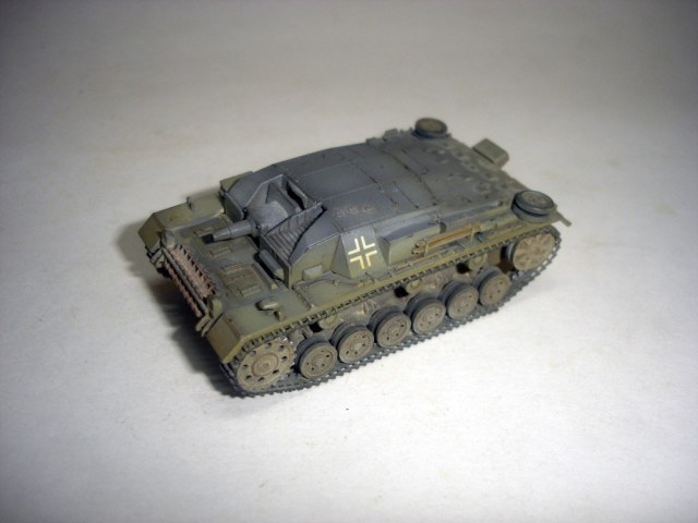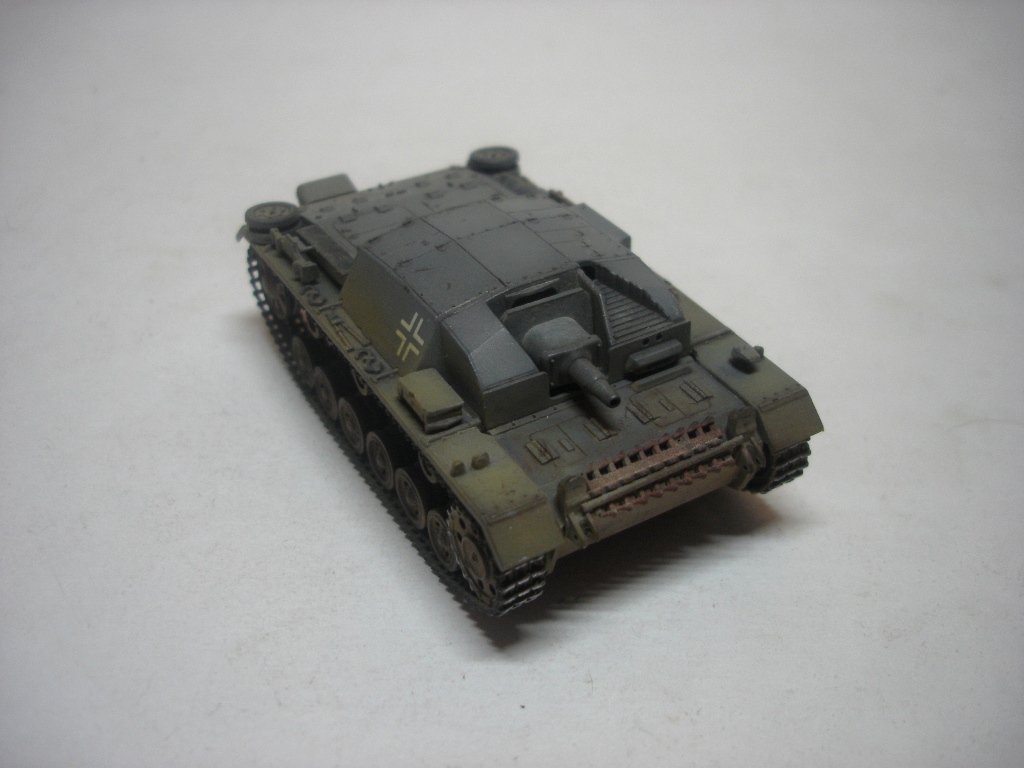 Штуг хорош. Маленький и аккуратный. Окраска понравилась, вашу игру с цветами на некоторых фото вполне видно. Из косяков отметил только звездочки от Ausf A (это конечно к производителю). А вот поручни на рубке,так же как и короб под антену, думаю, придали бы еще больше колорита модели. И не понял, почему вы прибор дымопуска так странно приклеили?