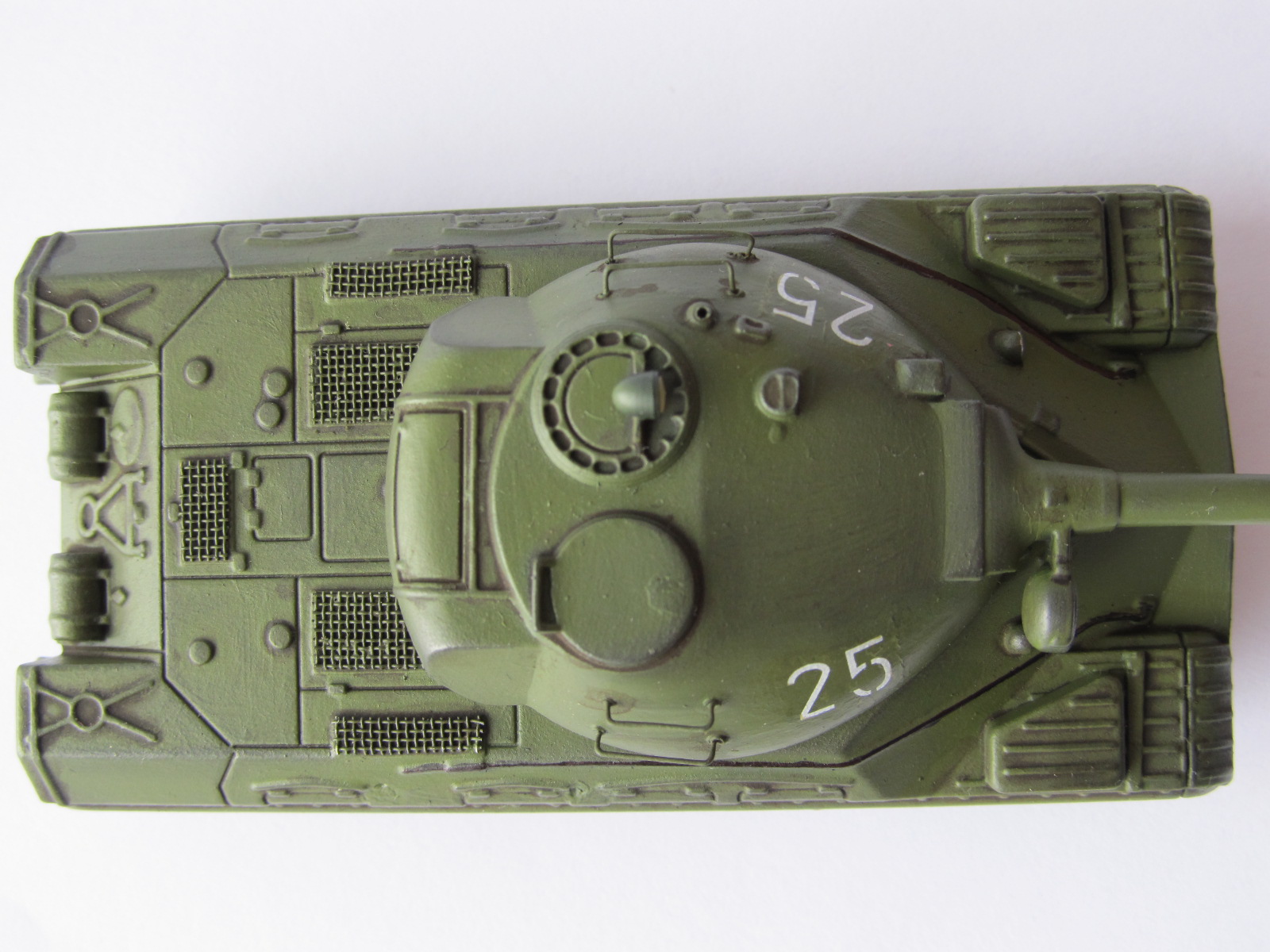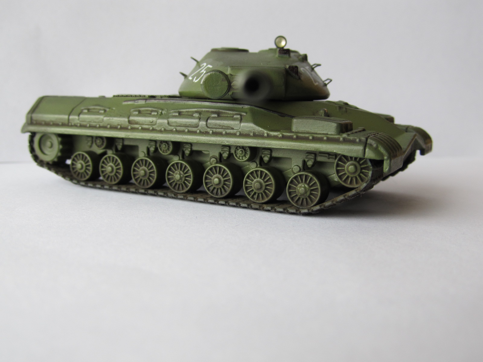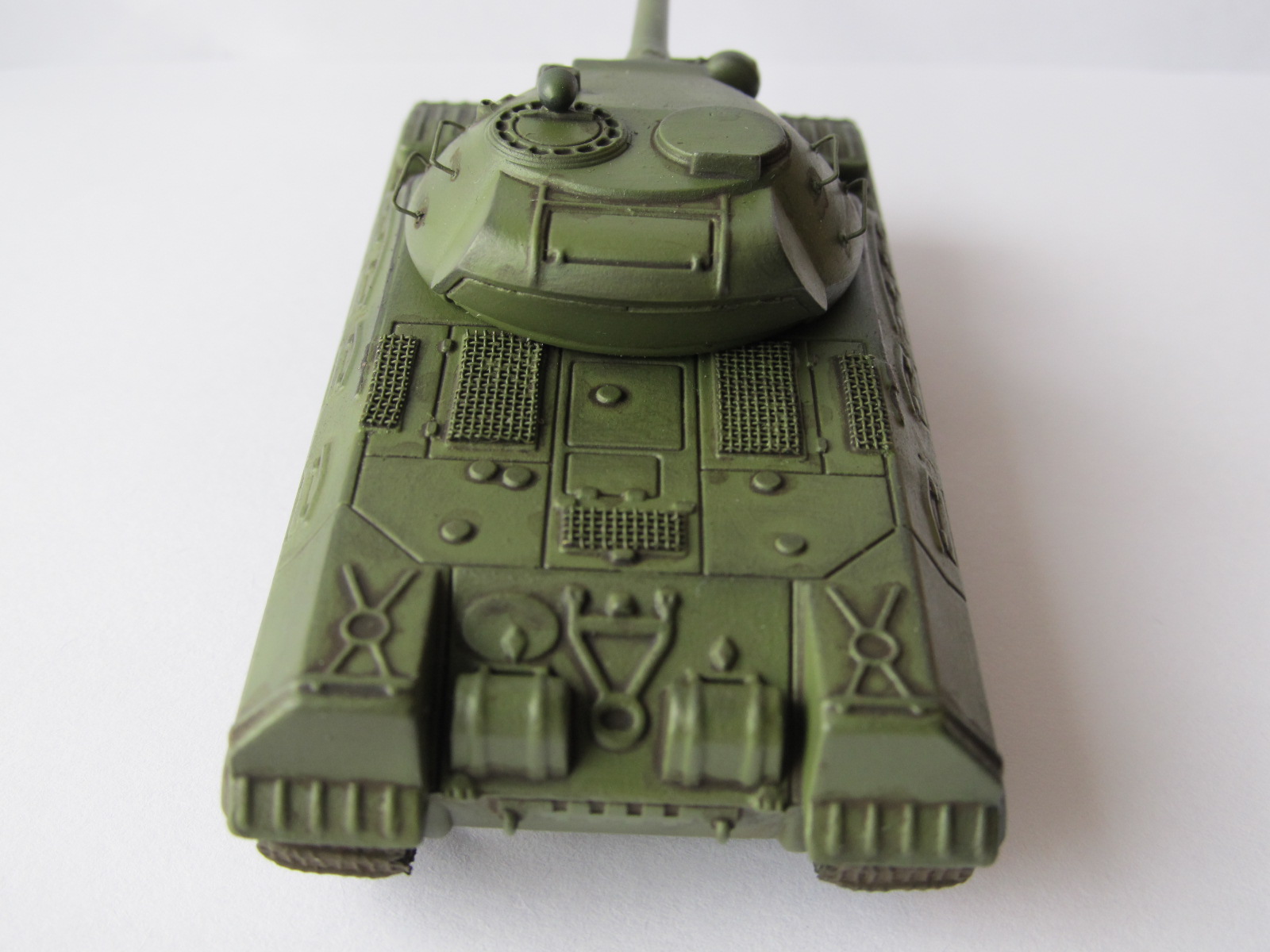 Хочу представить танк Т-10 из журнала Русские Танки. Моделью это не назовешь, потому что танки из этих журнальчиков славятся скудной детализацией, плохой проработкой деталей. Корпус железный, башня пластиковая, траки виниловые. Купил его потому что очень нравится этот танк, но аналогов увы нет ни в 35-ом, ни в 72-ом. Вот и решил его не много приукрасить. А именно: поручни на башне из проволоки, моторные сетки МТО, фара Elf, зашпаклевал щели на башне, добавил декаль от трюмпа. Красил кистью, Акан 4БО. Смывка Миг. Гусеницы окрашены тамией (их родной цвет был серый). Пыль на траках Мастер пигмент. Ну а последние две фотографии со строящимися Т-34 и Королевским тигром, так для сравнения размера.