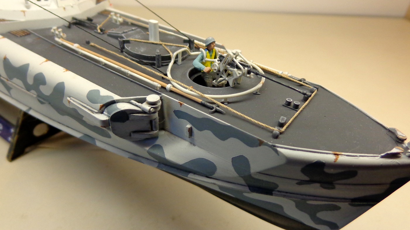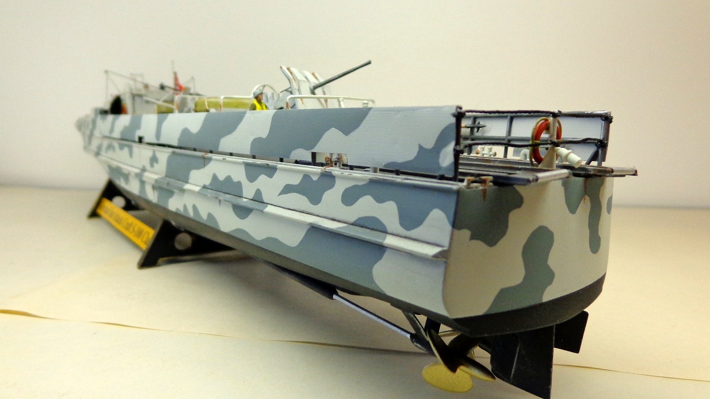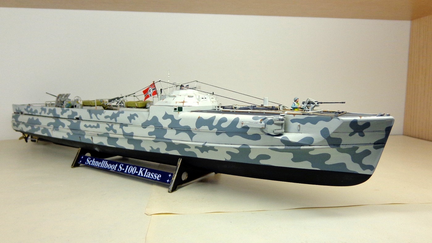 Эту модель я увидел на прилавке магазина игрушек четыре года назад. Открыв коробку я залюбовался стремительными формами корпуса и качеством отлитых деталей. Почти одновременно была куплена и книга "Атакуют "Шнелльботы", которую прочитал с интересом. Рассказывать подробно об этих кораблях я не стану, слишком много бед они принесли английским и русским морякам. Работа над моделью началась сразу же, но окончательная сборка- покраска происходила весной 2012года, когда у меня уже были необходимые инструменты. Это было накануне городской выставки и я как плохой студент перед экзаменом в последнюю ночь все еще что-то клеил, красил. Очень хотелось произвети впечатление, но это сделал другой мой "кораблик", не такой интересный как этот, как мне кажется. Окраска-"Звезда-супер" и немного тамиевского акрила. Камуфляж делался "по мотивам" маленького фото из книги, без привязки к конкретному прототипу. "Ржавчины" совсем немного, корабль-то деревянный. Уважаемые коллеги, если кто-то хочет что-то подсказать, поправить, с интересом выслушаю.