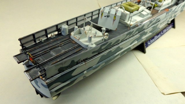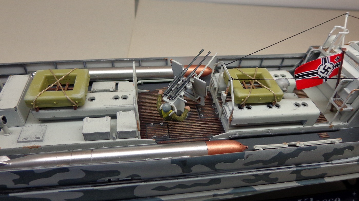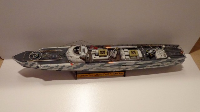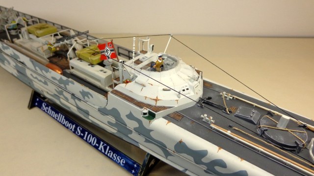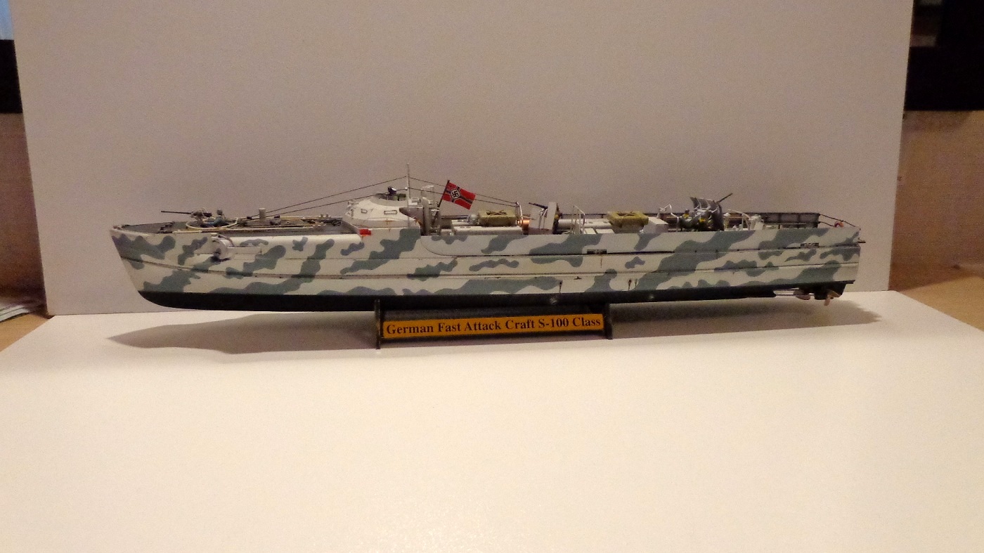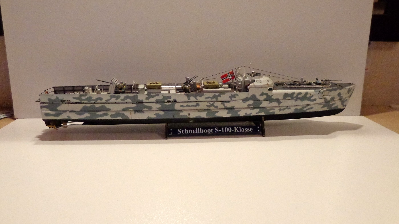 Эту модель я увидел на прилавке магазина игрушек четыре года назад. Открыв коробку я залюбовался стремительными формами корпуса и качеством отлитых деталей. Почти одновременно была куплена и книга "Атакуют "Шнелльботы", которую прочитал с интересом. Рассказывать подробно об этих кораблях я не стану, слишком много бед они принесли английским и русским морякам. Работа над моделью началась сразу же, но окончательная сборка- покраска происходила весной 2012года, когда у меня уже были необходимые инструменты. Это было накануне городской выставки и я как плохой студент перед экзаменом в последнюю ночь все еще что-то клеил, красил. Очень хотелось произвети впечатление, но это сделал другой мой "кораблик", не такой интересный как этот, как мне кажется. Окраска-"Звезда-супер" и немного тамиевского акрила. Камуфляж делался "по мотивам" маленького фото из книги, без привязки к конкретному прототипу. "Ржавчины" совсем немного, корабль-то деревянный. Уважаемые коллеги, если кто-то хочет что-то подсказать, поправить, с интересом выслушаю.
