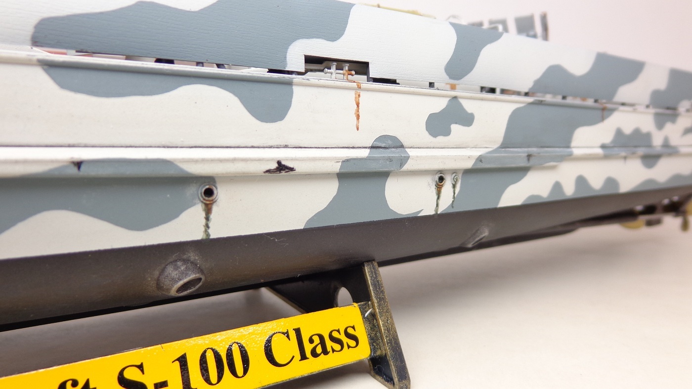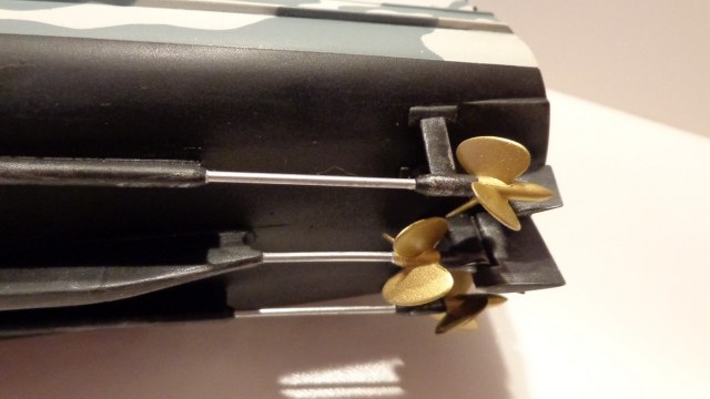 При МАКРО углядел немного облоя и заметную границу КАМО, но больше всего заметно несоответствие подржавленного верха и чистейшего днища. Да, в книге "Атакуют шнелльботы" есть фотография винтов - явно не то что Ревелл предлагает в своих отливках.