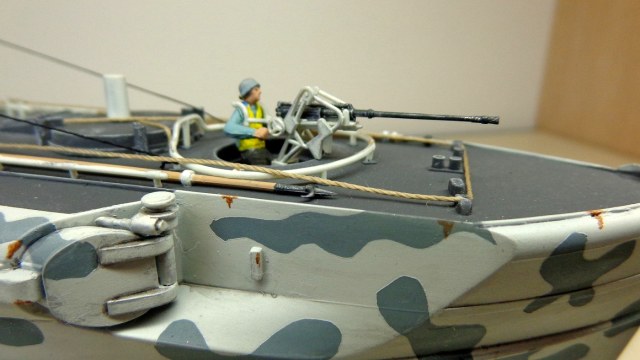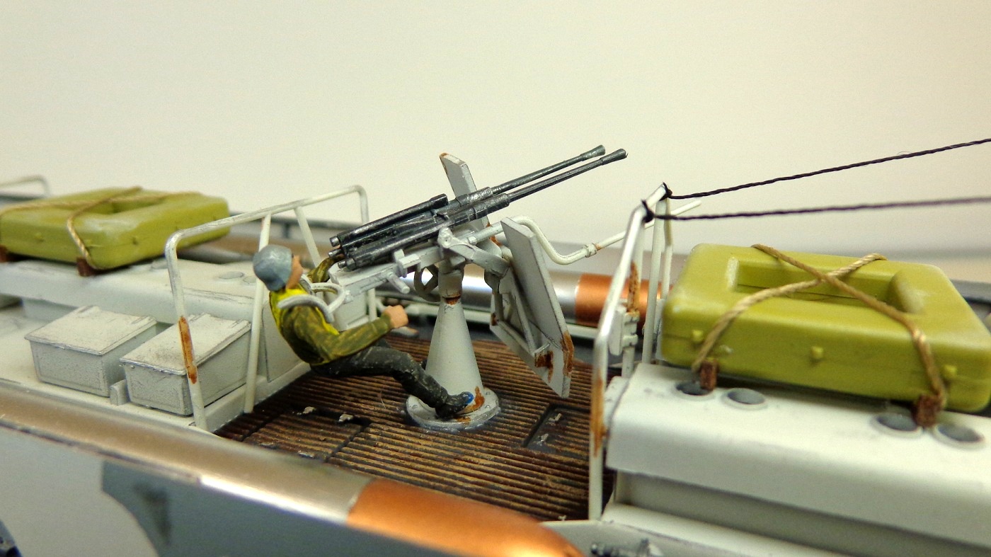 Всем большое спасибо за оценки и замечания. Вы совершенно правы, "залил" краской, получилась "ступенька", где-то сошкурил ее, но не везде. И ржавчина очень контрастна на белой поверхности. Пока еще не знаю как ее делать мягче. Канат просто нитка, то ли из этого набора, то ли из другого. Глубинных бомб в наборе не прилагалось, а сам делать не стал. "Падающий пулеметчик"... По другому фигурка не вписывалась, а "ломать" ему руки ноги-руки не хотелось. Вообще, эти полиэтиленовые немцы не хотели и краситься, даже после грунтовки. Извините коллеги, а есть у кого-нибудь фото советских "Восперов", в интернете нашел всего три-четыре?
