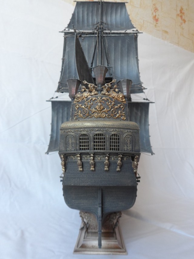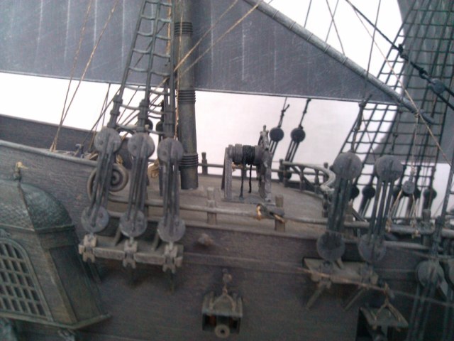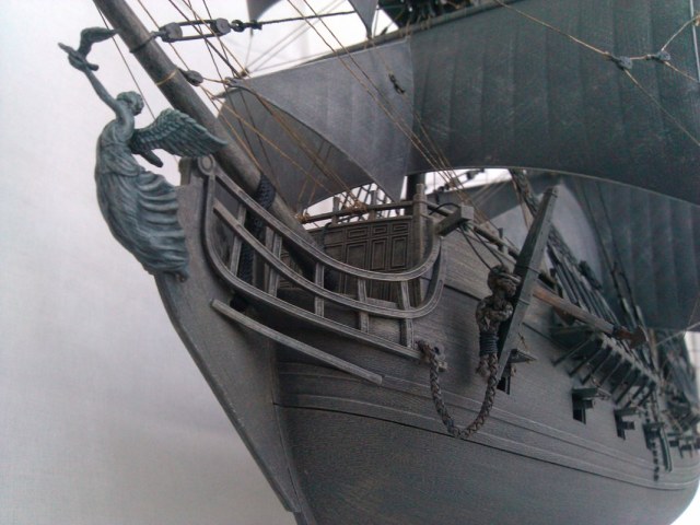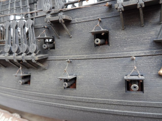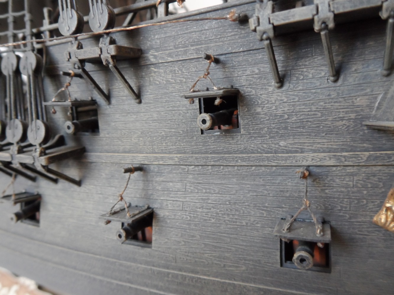 Работа большая. Первый раз внимательно посмотрел этот кораПЬ. Раньше не очень присматривался,не моё. Что бросилось в глаза. Архитектура парусника ,мне кажется, предусматривает блинда -мачту и блинда-рей. У него и бушприт потому такой куцый. Неправильно обоснованы юферсы. Кноп всегда обращён к палубе. Крышки портов открывались талями,а здесь привязаны за какие-то шпеньки.Перо руля наверняка просто "прилагательное" к корме. Гельмпорта нет.Княвдигед-тоже " прилагательное" Но это косяки производителя.
