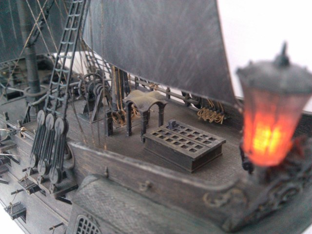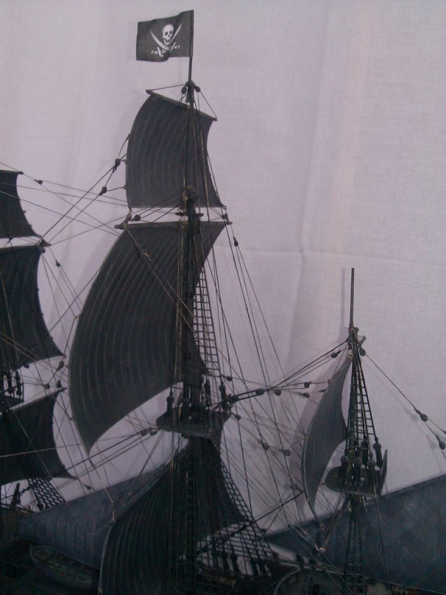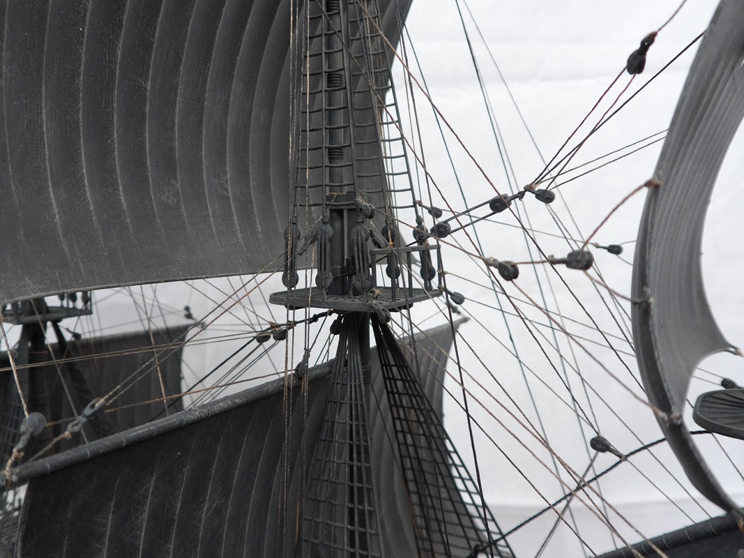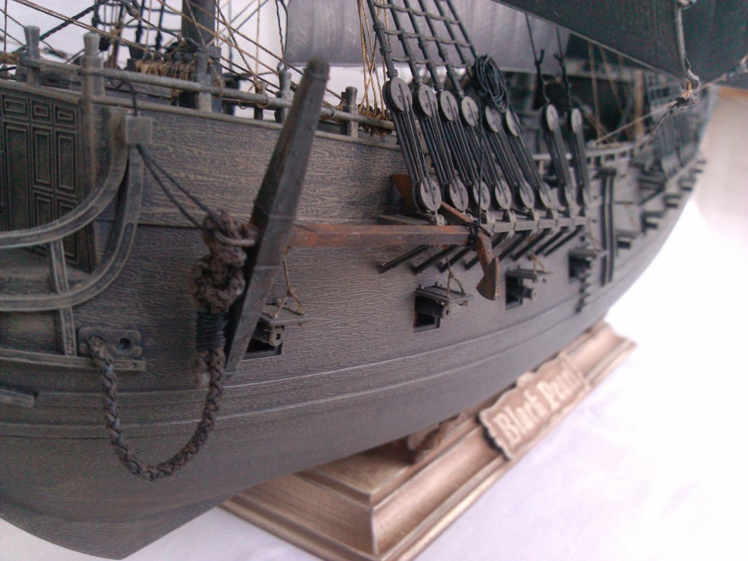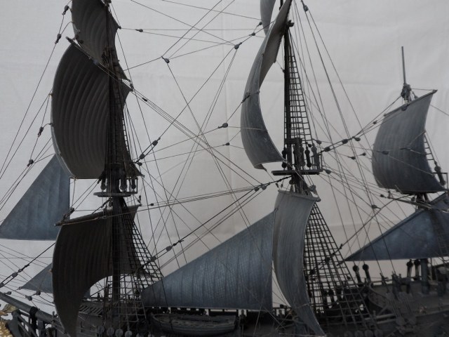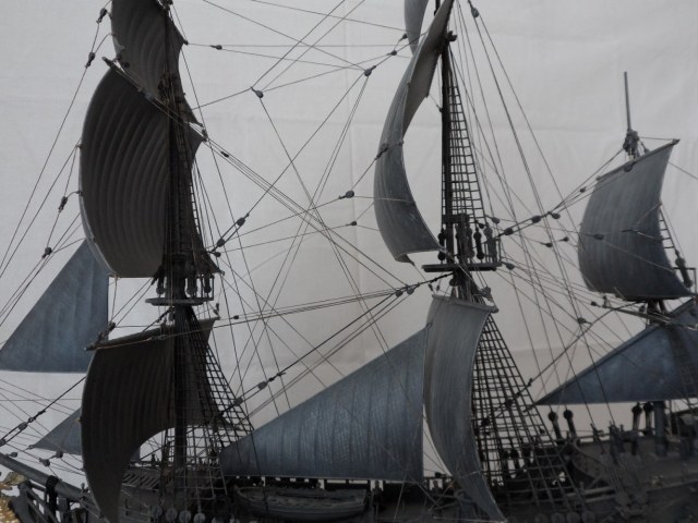 Из того что увидел,всё понравилось.Окрашен и тонирован с довольно таки редкой аккуратностью.Верёвки органично вписываются ровно как и паруса с корпусом.7-ое фото вообще на кадр из фильма похоже.Для оживления модели нехватает разве что немного ненавязчивых потёков со шпигатов и от проёмов орудийных портов.Я б есчё немного оттонировал бы юферсы,совсем чуть чуть.В общем,для изкоробки очень здорово.Про паруса хочеться сказать(вот вам и вакушки...)чем плохи?Возможно стоило попробовать симитировать подобную как на парусах текстуру и на пластиковых вантах?