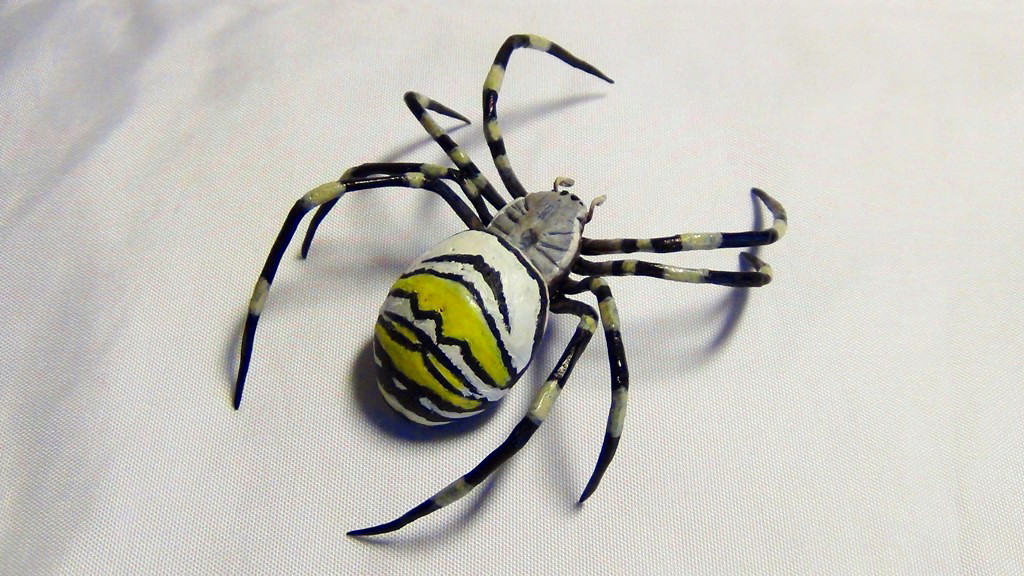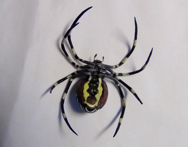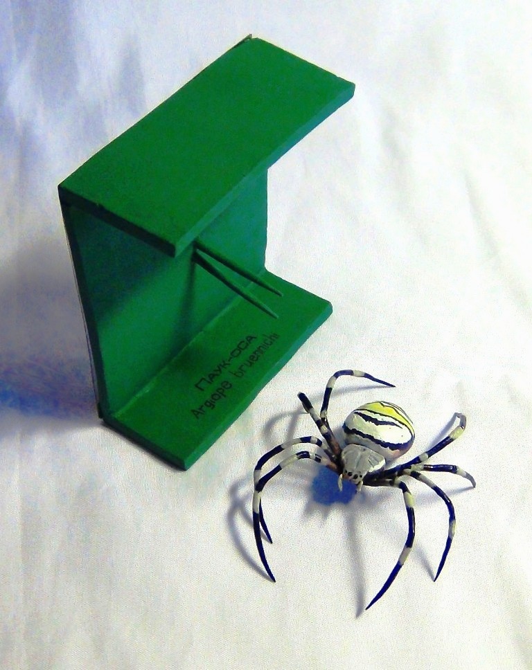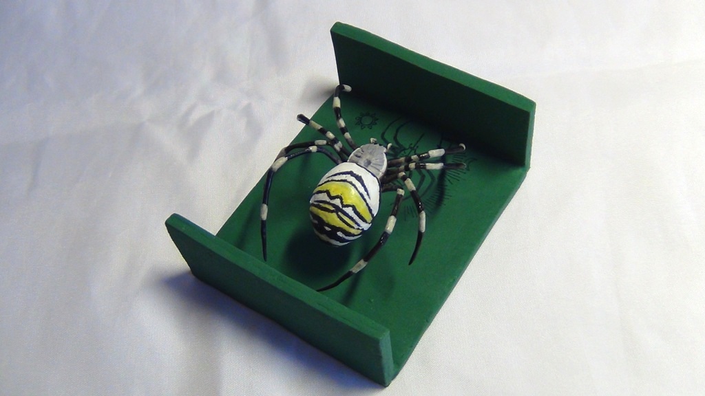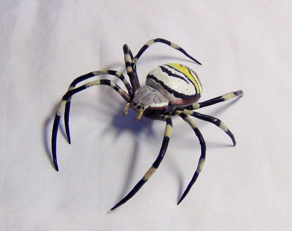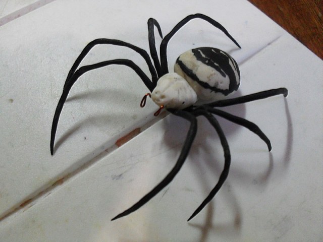 Процесс работы мелочно описывать не буду, т. к. всё то же: насекомое из пластики и плюс проволока в качестве каркаса ножек, подставка из гипсовой массы. Краски: olki, Акан, немного гуашь, полуглянцевый и фосфорный лак (светится в темноте). Масштаб, я думаю, 2:1, потому что модель моя где-то 7 см в длину, ну и полюбасу самка))) Делал с точностью по фоткам.