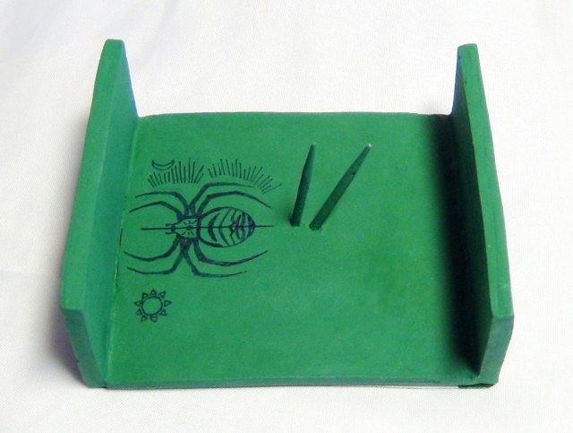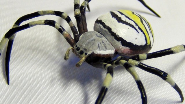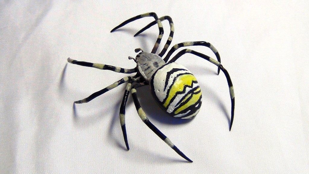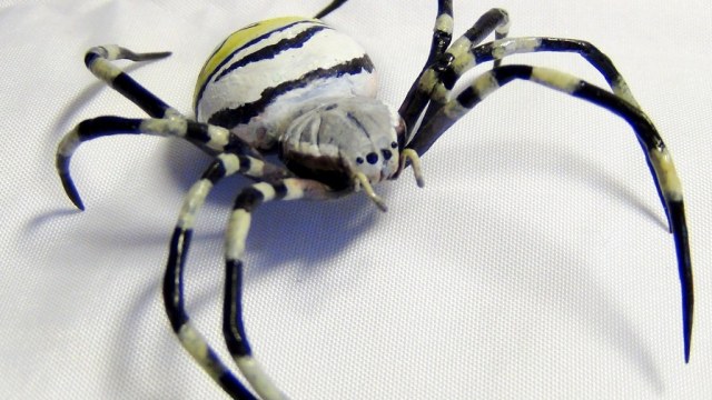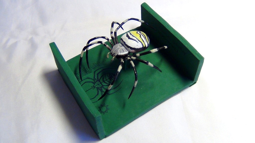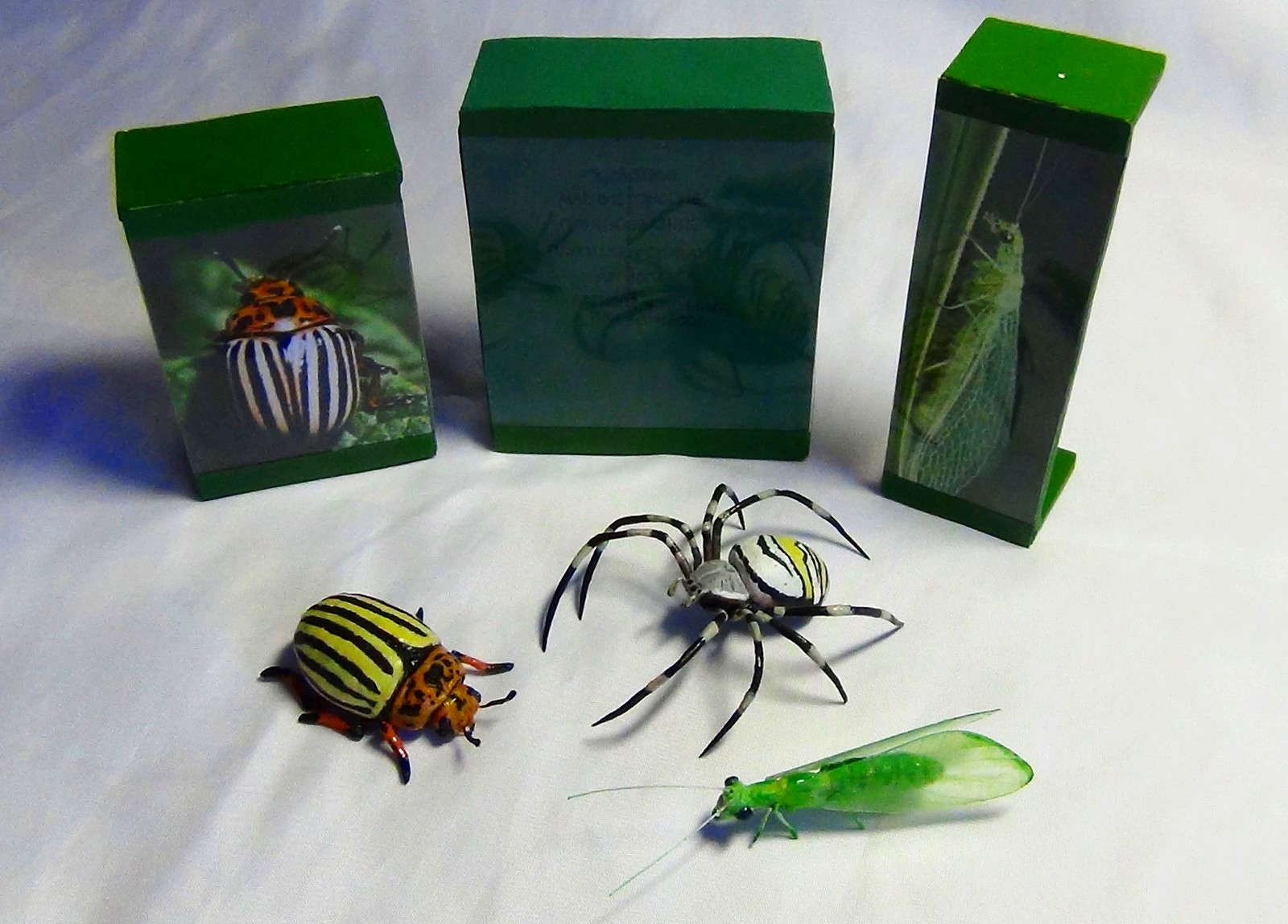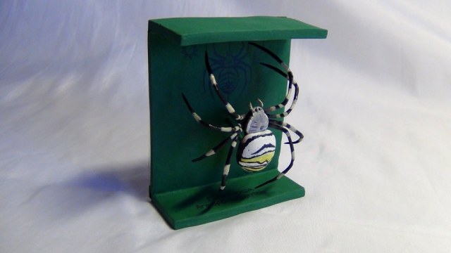 Процесс работы мелочно описывать не буду, т. к. всё то же: насекомое из пластики и плюс проволока в качестве каркаса ножек, подставка из гипсовой массы. Краски: olki, Акан, немного гуашь, полуглянцевый и фосфорный лак (светится в темноте). Масштаб, я думаю, 2:1, потому что модель моя где-то 7 см в длину, ну и полюбасу самка))) Делал с точностью по фоткам.