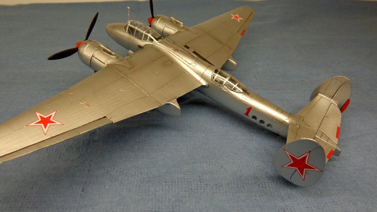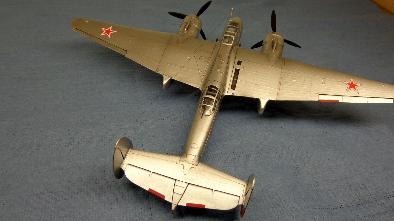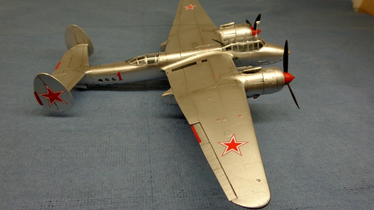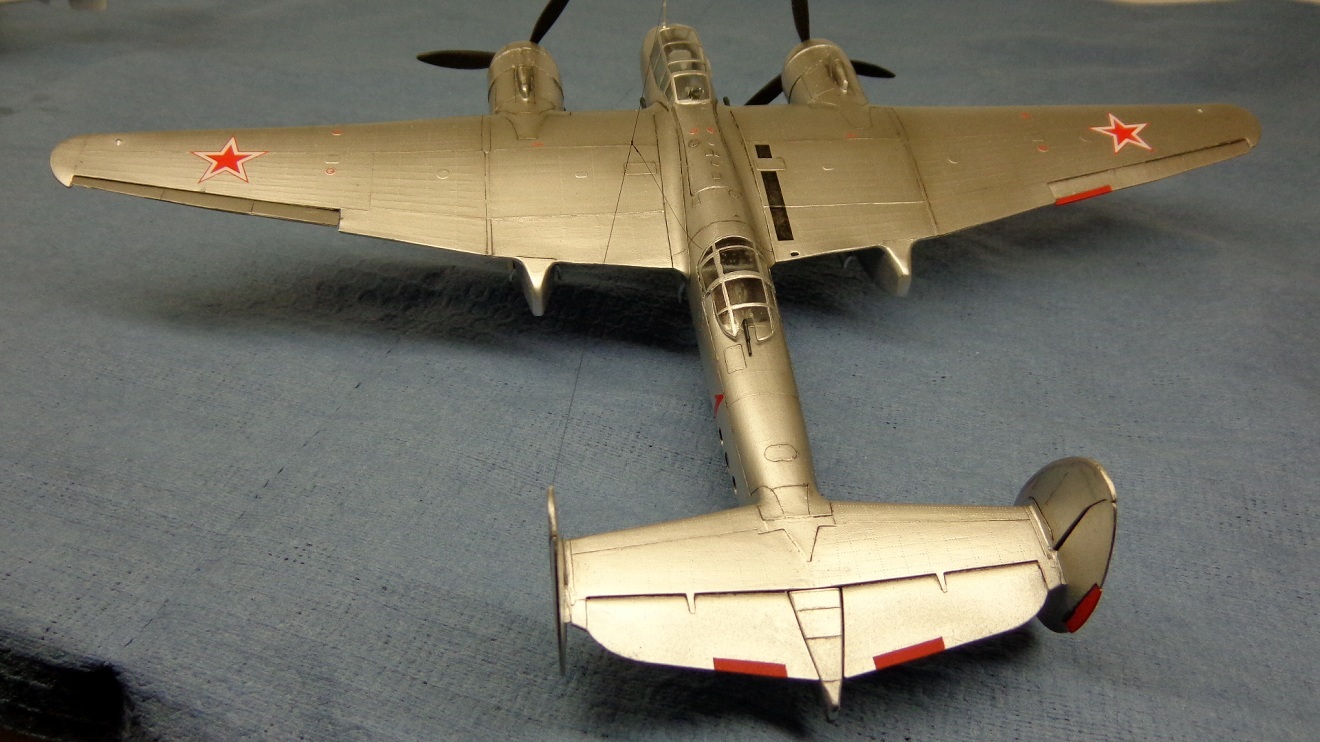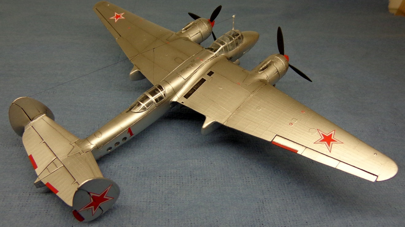 Обилие свободного времени в эти продолжительные майские "каникулы" подтолкнуло меня закончить один свой "долгострой". Даже и не вспомню когда эта модель была куплена и склеена. Оставалось только подготовить мелкие детали и покрасить. А тут еще наткнулся в интернете на фото Ту-2 из состава 1 ГвМТАП, будто бы не нем летал командир 1АЭ Ф.Н.Макарихин(известный по своей "работе" в 51 МТАП). Самолет имел необычную окраску, это меня и привлекло. Модель была завершена быстро, использовалась краска ALUMINO 71.062 от "Vallejo", а под нее грунтовка "Акан". Но поторопившись, проглядел то, что самолет должен быть снизу ГОЛУБЫМ. Жутко расстроился. Надо бы перекрашивать, но очень боюсь испортить и поломать уже готовую модельку. И вот пока не испортил решил вам показать, уважаемые каропчане то, что есть.