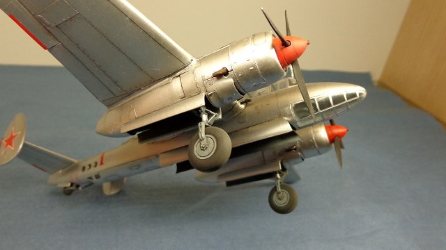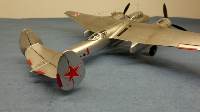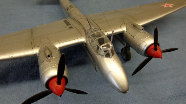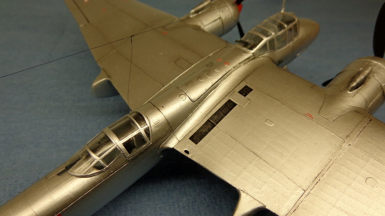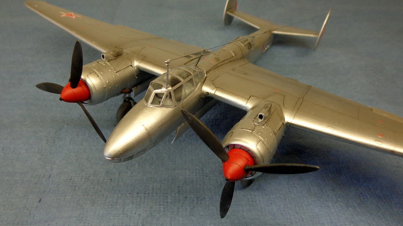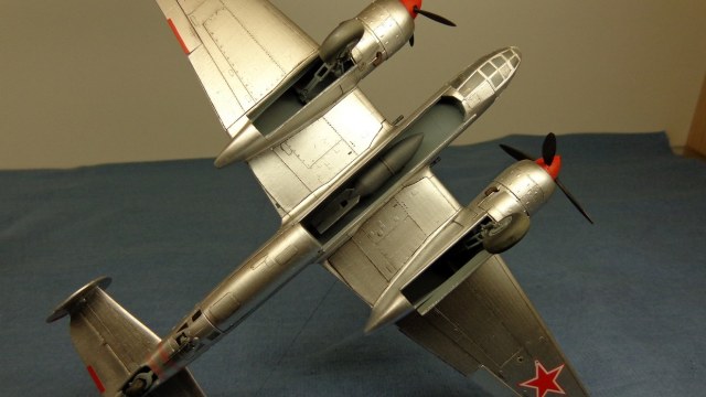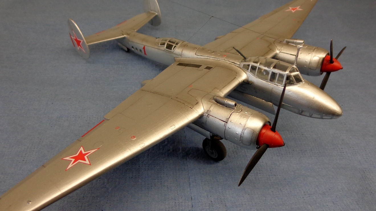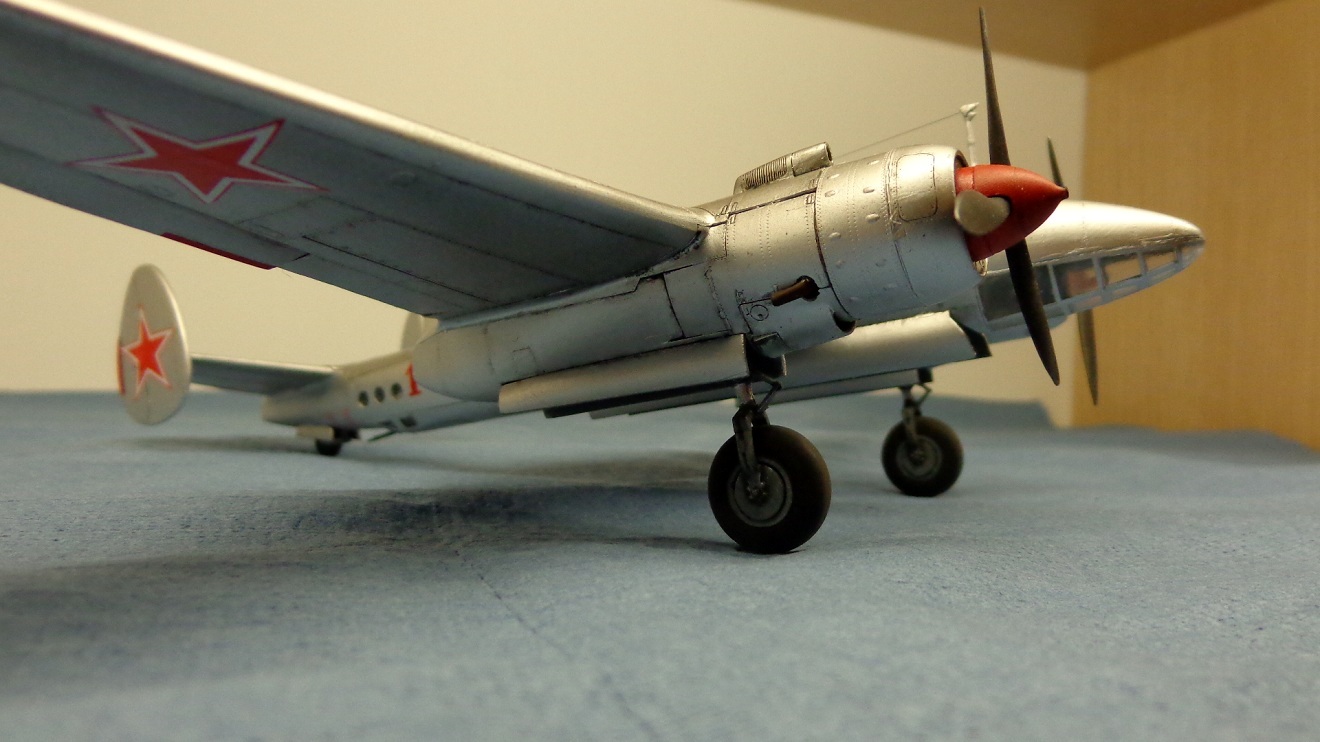 Обилие свободного времени в эти продолжительные майские "каникулы" подтолкнуло меня закончить один свой "долгострой". Даже и не вспомню когда эта модель была куплена и склеена. Оставалось только подготовить мелкие детали и покрасить. А тут еще наткнулся в интернете на фото Ту-2 из состава 1 ГвМТАП, будто бы не нем летал командир 1АЭ Ф.Н.Макарихин(известный по своей "работе" в 51 МТАП). Самолет имел необычную окраску, это меня и привлекло. Модель была завершена быстро, использовалась краска ALUMINO 71.062 от "Vallejo", а под нее грунтовка "Акан". Но поторопившись, проглядел то, что самолет должен быть снизу ГОЛУБЫМ. Жутко расстроился. Надо бы перекрашивать, но очень боюсь испортить и поломать уже готовую модельку. И вот пока не испортил решил вам показать, уважаемые каропчане то, что есть.
