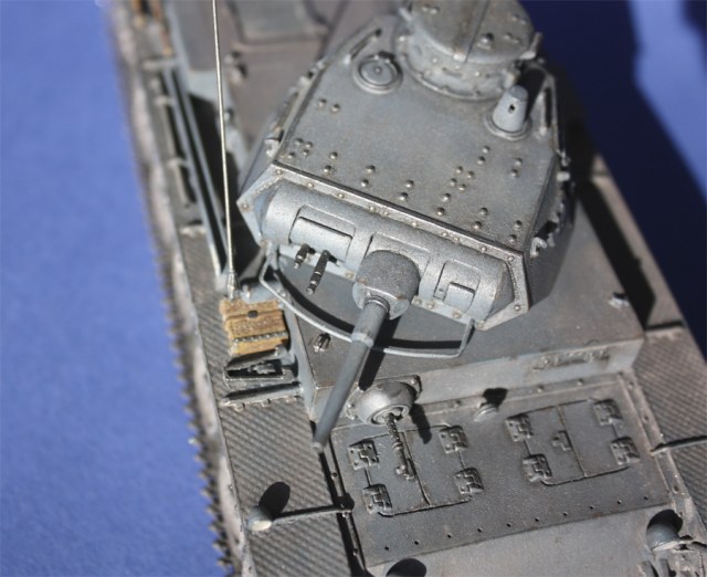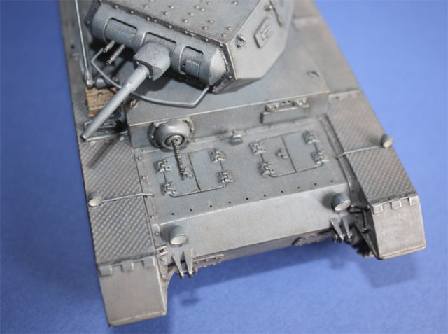 На модели изготовлен настоящий механизм натяжения гусениц, работу которого можно посмотреть на сдвоенной фотографии.