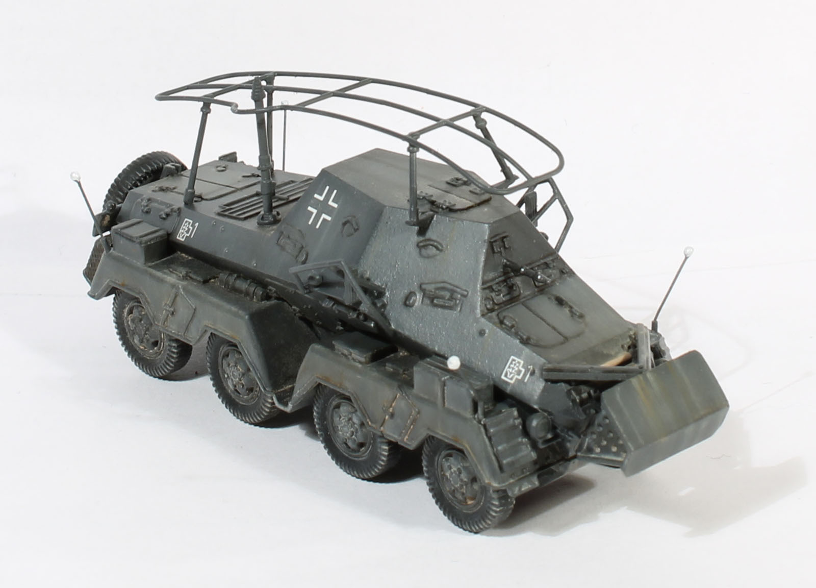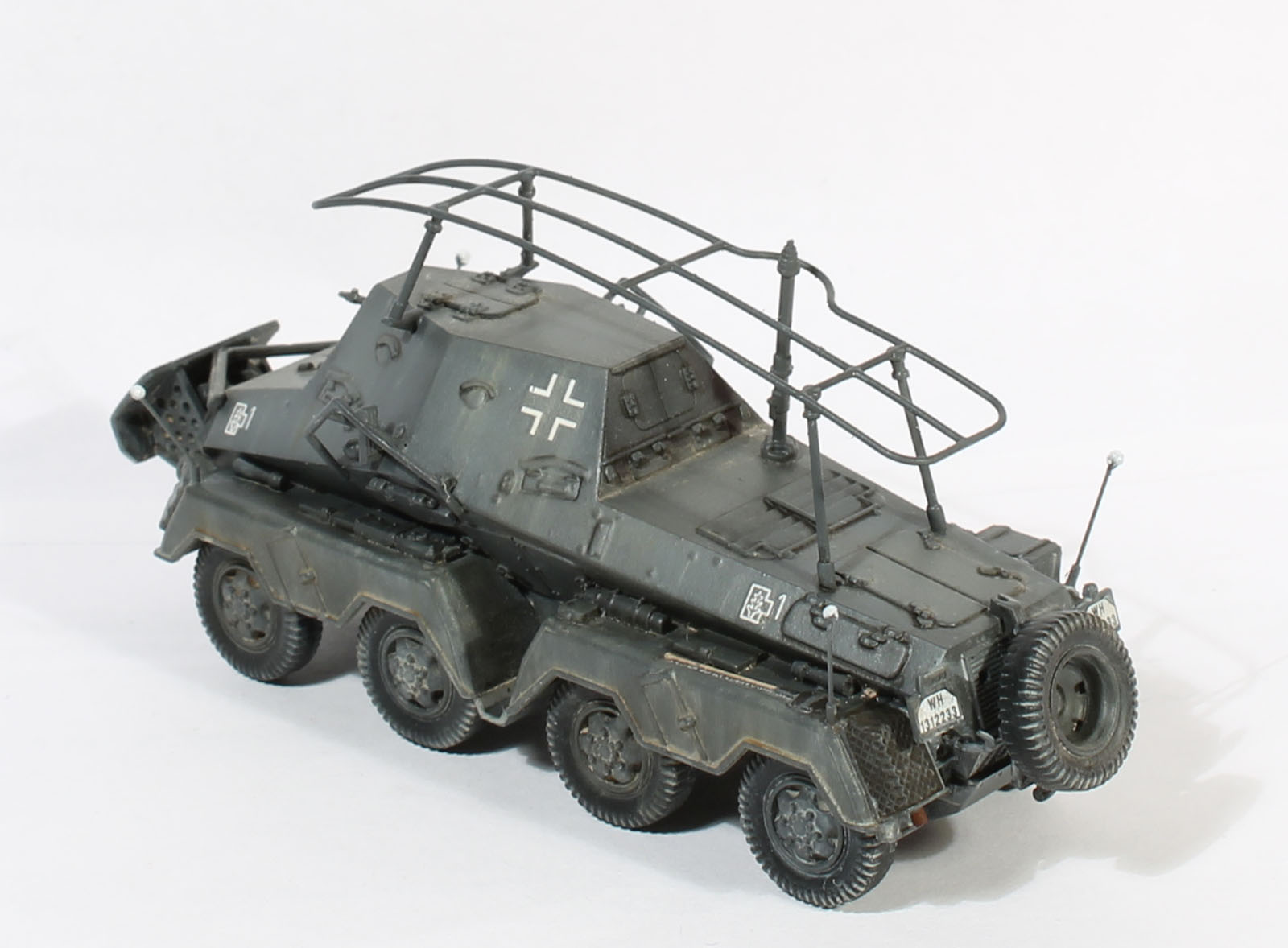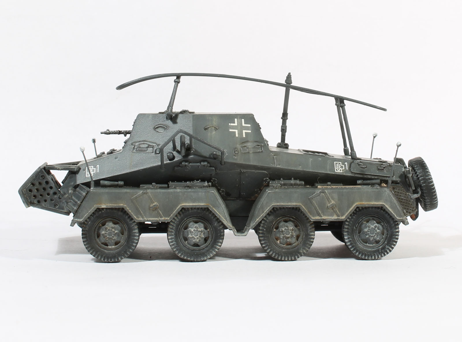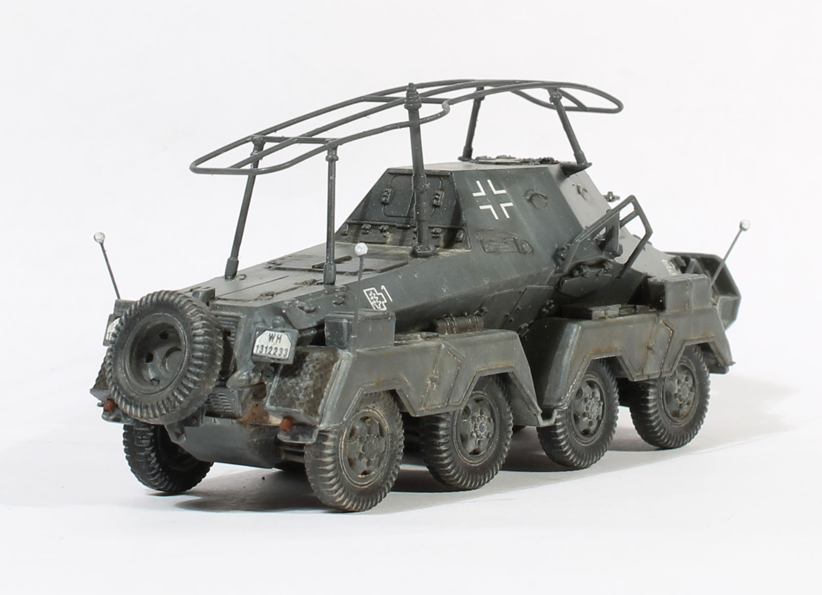 Интересная машина, отличное исполнение! Единственное замечание: колеса не вдавленны (пневматики в нижней точки не сжаты) под весом машины. Вопрос: как делали усы, точнее шарики на конце? Красили аэрографом?
