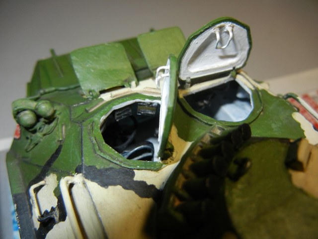 командир изначально по задумке сидел высунувшись из своего люка,, но теперь перескоп не даёт это сделать ему полноценно, поэтому вздыхая он переместился с картой подмышкой в десантный люк.