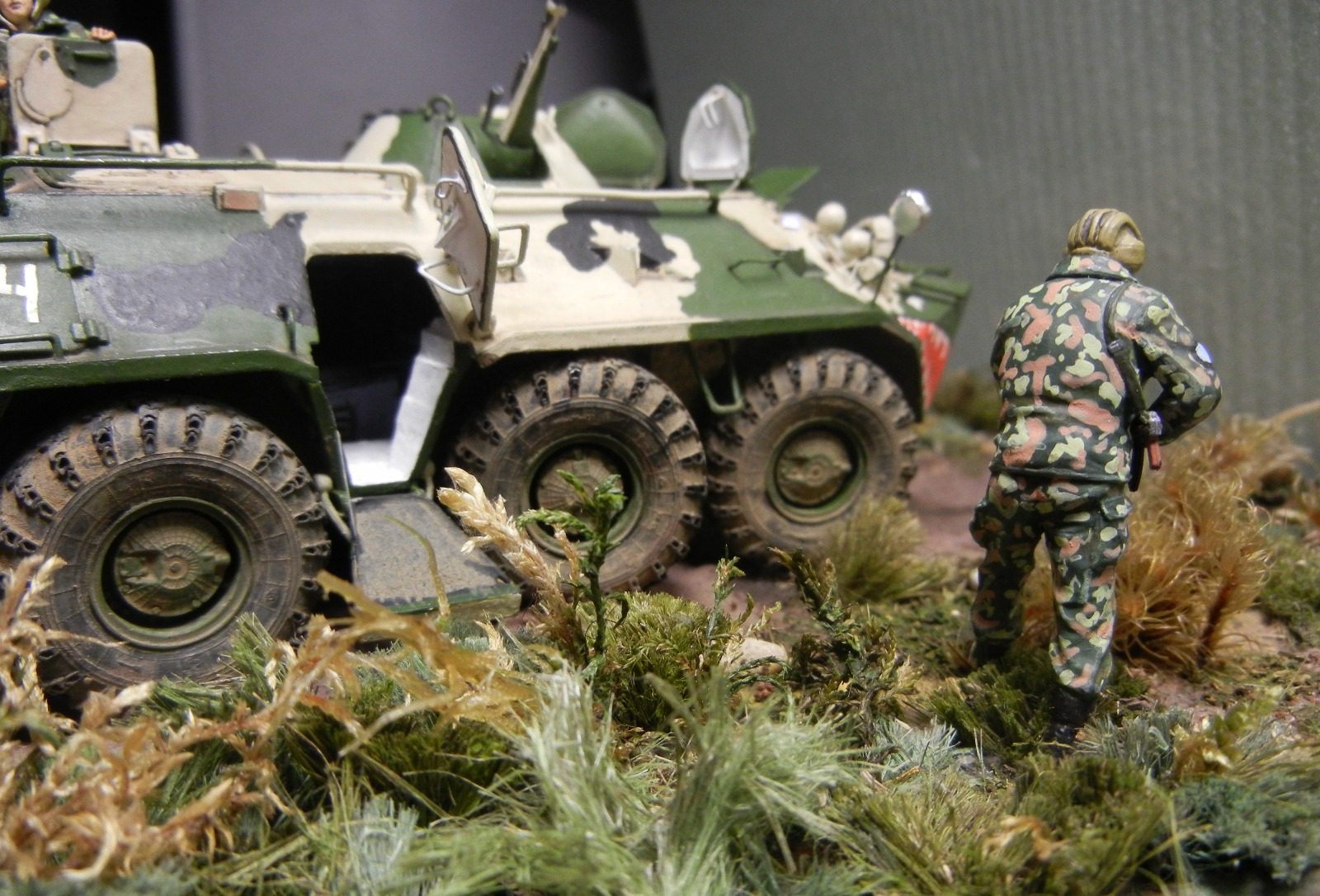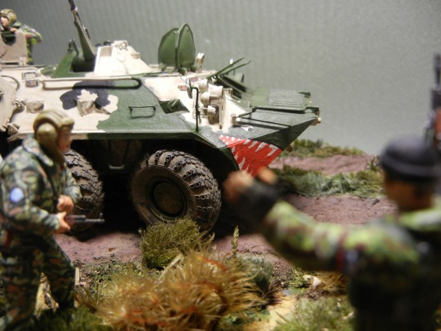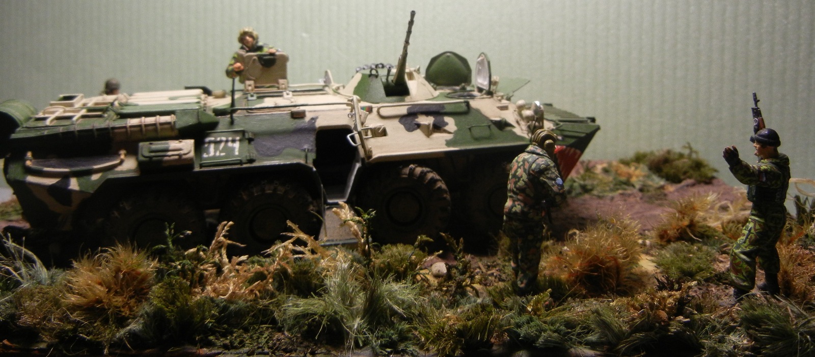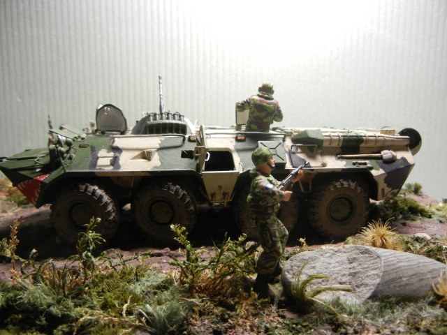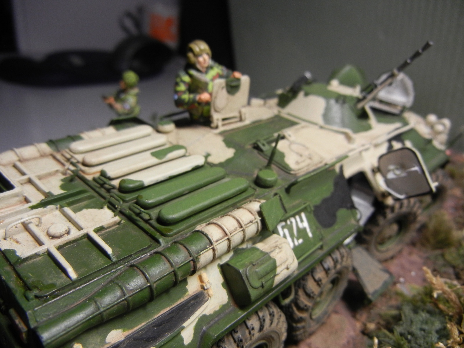 Восьмидесятку заново собрал, перекрасил . БТР "смыт" АК и припылен "МАСТЕР ПИГМЕНТ" слегка. Ну не нравятся мне "грязные" модели! Колеса отправил в топку .куда им и дорога. Добавил ручек /поручней.