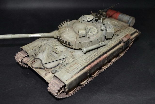 Прикольная модель получилась следы эксплуатации понравились. На мой взгляд лучше бы бочки были в цвет танка, у меня такая же модель в каробке говорят что нормальная 72ка советская из неё не получится так как таия даёт Т-72м1 а не Т-72А, сложно с прототипом определится!