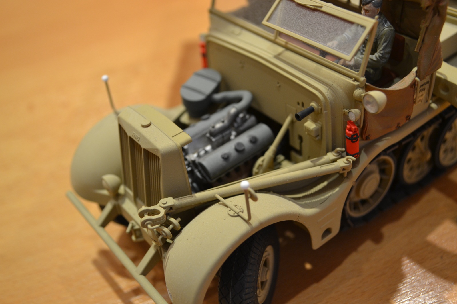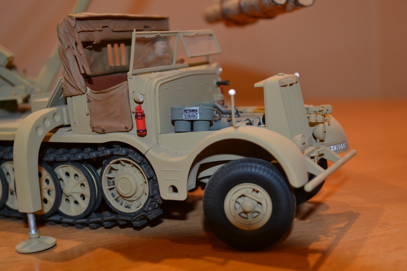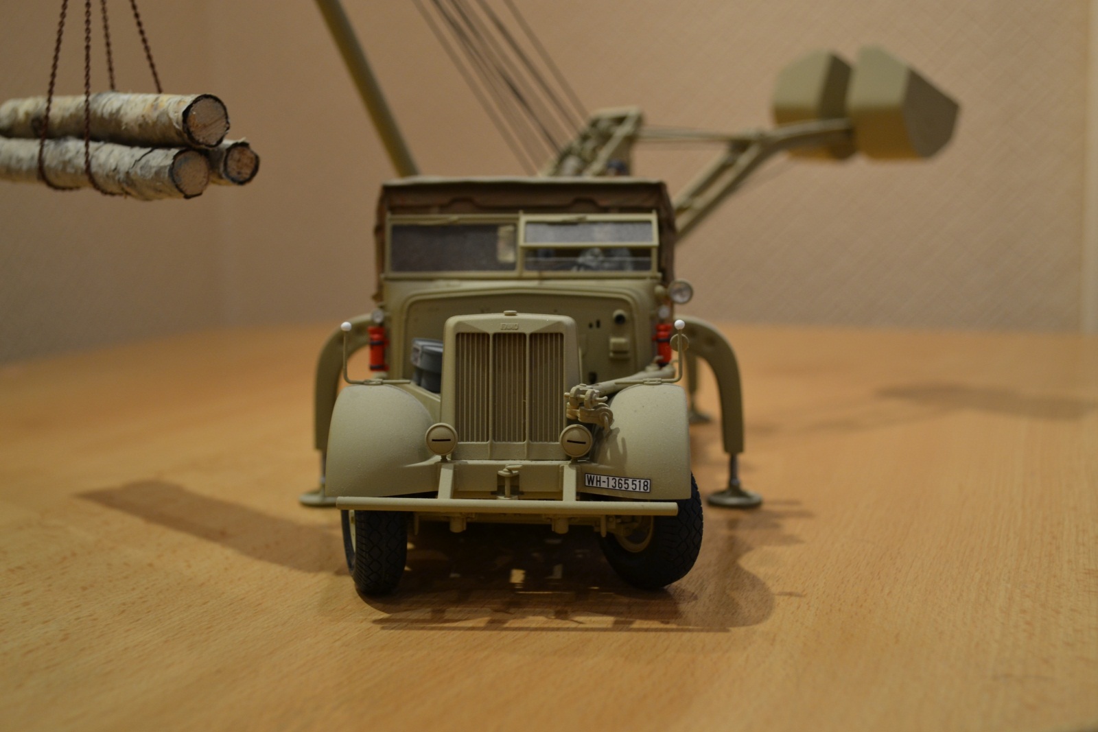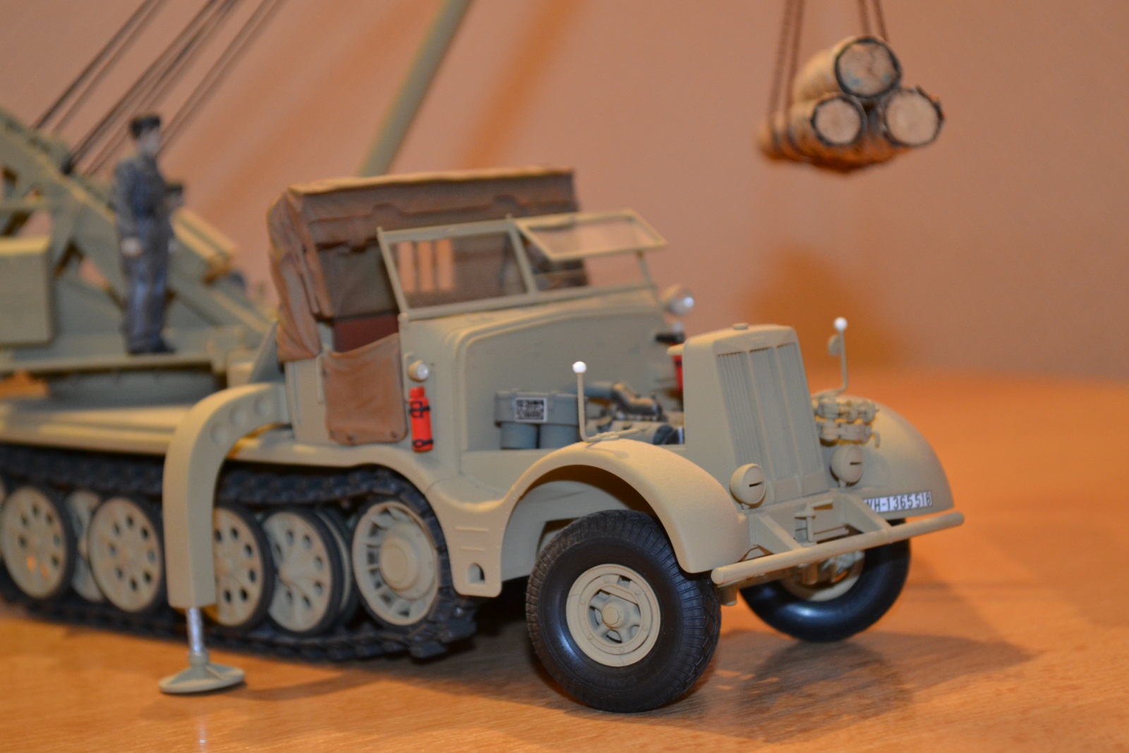 На изготовление ушло около 3 месяцев из которых львиная часть была потрачена на сборку крана, т.к. сама машина от Tamya собралась на 1 щелчке. Первый раз столкнулся со смолой и могу сказать, что Wespe Models в части их набора № 35076 – удел тех, кто очень хочет иметь на полке Sd.Kfz. 9/2 (говорю, сравнивая этот набор Wespe Models с набором от Plus Model, конверсию с которым делаю сейчас). Очень много пузырей, порой по 5 мм в диаметре, которые насквозь пронизывают деталь, часть деталей (стрела противовеса крана и рабочая площадка) пролиты не просто с очень большим количеством облоя (приходится просто выковыривать деталь из облоя), но и толщина в некоторых местах не больше толщины полиэтиленового пакета (берешь в руки и не знаешь как подступиться чтобы не сломать).Фото прилагаю. Некоторые детали я так и не смог обработать как следует и заменил их на «нечто» из пластика, пожертвовав копийностью. Площадка, на которую был замене кузов «Famo» из набора Wespe Models несколько короче чем нужно, пришлось сделать ее из листового пластика Tamya, срезав с нее поворотный механизм. Когда же из горы пластика и смолы получился образ этой действительно огромной штуки я понял, что потраченные нервы и маты, которыми я покрывал кран и пыль смолы, которой я надышался, прошли не зря. Шикарная штука.
