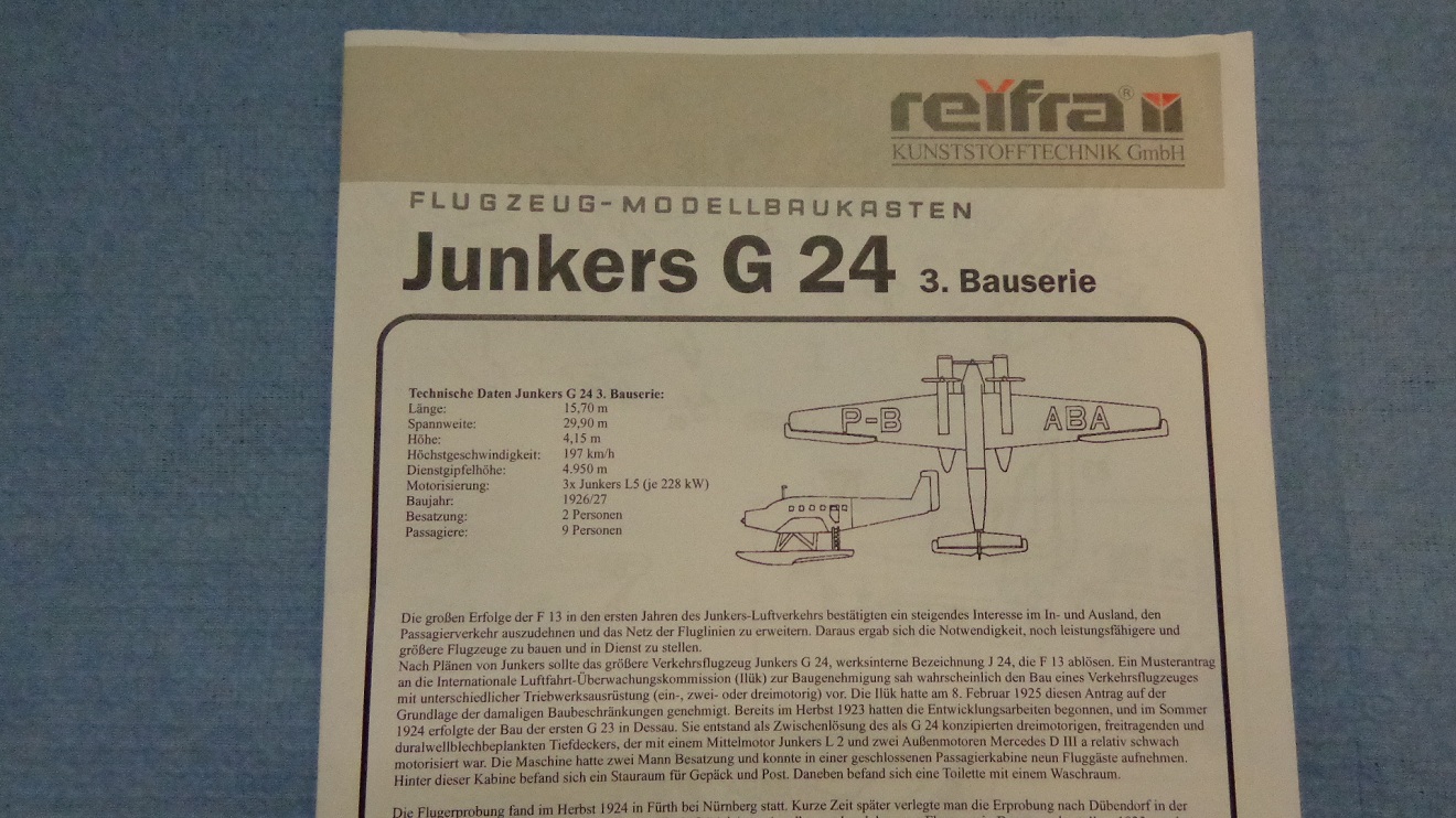 Только что получил модель Junkers G 24 от немецкой фирмы "Reifra". Производитель никто иной, как всем знакомый с детства VEB Plasticart из города Annaberg-Buchholz. На этикетке стоит дата изготовления 23.10.2012. Довольно большая коробка серебристого цвета, похожая на пенал. Внутри четыре литника из серого пластика, три - из черного и один - из прозрачного, инструкция на немецком и декаль. Облой минимален, смещения не наблюдается, а вот утяжины на утолщениях деталей присутствуют. На деталях капота двигателей расшивка внутренняя, а на поплавках - наружняя. Декаль на два варианта: один-шведский, другой, наверно, бразильский. Кому-то эта модель уже знакома под этикетками сначала "MASTER MODELL", а потом "REVELL".Как я понял в данный момент кроме "Юнкерса" производятся: Ил-62, Ту-154, Ту-20 и Ил-4. Последнюю модель я вам, коллеги, недавно показывал в собранном виде. Модели "Reifra" можно приобрести в Москве. Наберите: veb-plasticart.com.