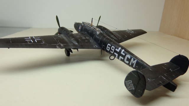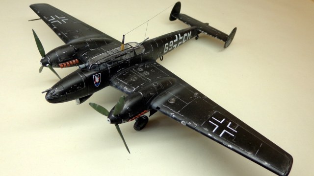 Я не фанат "Люфтваффе", но какая же коллекция самолетов 2-й мировой без этого истребителя. В прошлом году в модельных магазинах нашего города появилось много красненьких коробок с надписью "Airfix", среди них и Ме-110. На первый взгляд модель мне понравилась и я купил даже две штуки. Модель собирается легко, быстро, шпаклевка потребовалась, но совсем не много. Единственно жаль - в наборе отсутствуют некоторые мелкие детали, но я подобрал подходящие. Хотелось сделать ночной истребитель из группы 1/NG1, но не из-за восторга их победами, просто эмблема вызвала симпатию(сова сидящая на полумесяце). Но в декали "Траверс", что была у меня, с этой эмблемой не все в порядке. Правильную деку найти не удалось и я взял другой вариант. А под этот вариант пришлось доработать модель: поставить ИК-прожектор и прицел на лобовое стекло. Также придал самолетику "бывалый" вид. Вот, пожалуй и все.