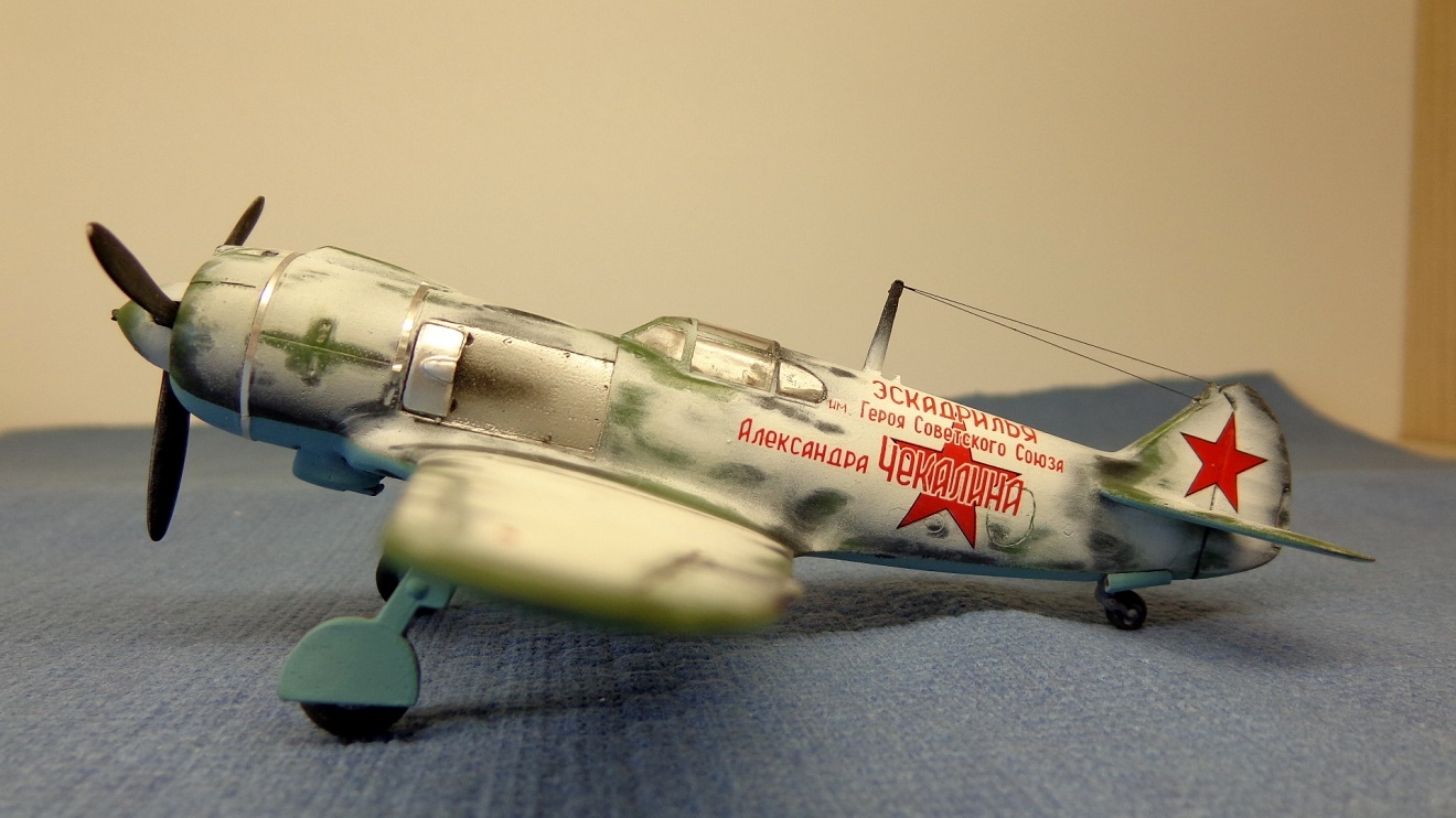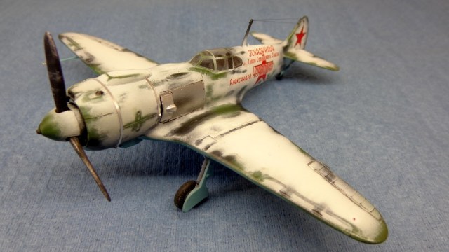Эти модели появились в начале 90-х. Я купил их две. Первую сделал еще в 95 году. Сегодня та моделька выглядит не очень, поэтому недавно вынул из шкафа другую и решил сделать. Черный пластик немного похожий на полиэтилен. При склейке потребовалось немного шпаклевки, а вообще сборка не вызывает проблем, получилось быстро. Колеса от "Эльф" пролежавшие в запасе много лет. Да, пришлось "передвинуть" одну из пушек, первоначально они не симметричны. Сначала сделал черно-зеленый камуфляж("Звезда-супер") и он мне так понравился, что чуть не остановился на нем. Но все-таки продолжил и сверху покрасил белым акрилом "тамия", а затем его "ободрал". Декаль из набора "Travers", хранившаяся тоже с 90-х. Окончательно модель представляет собой исребитель Ла-5 из состав 960 ИАП, на котором летал испанец Франсиско Мероньо(согласно некоторым источникам), самолет имеет индивидуальную надпись в память о погибшем партизане. На правом борту надписи воможно и не было.