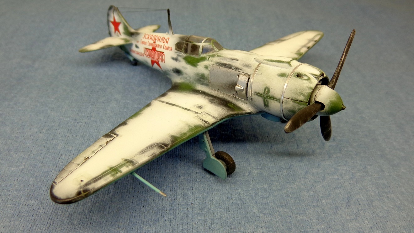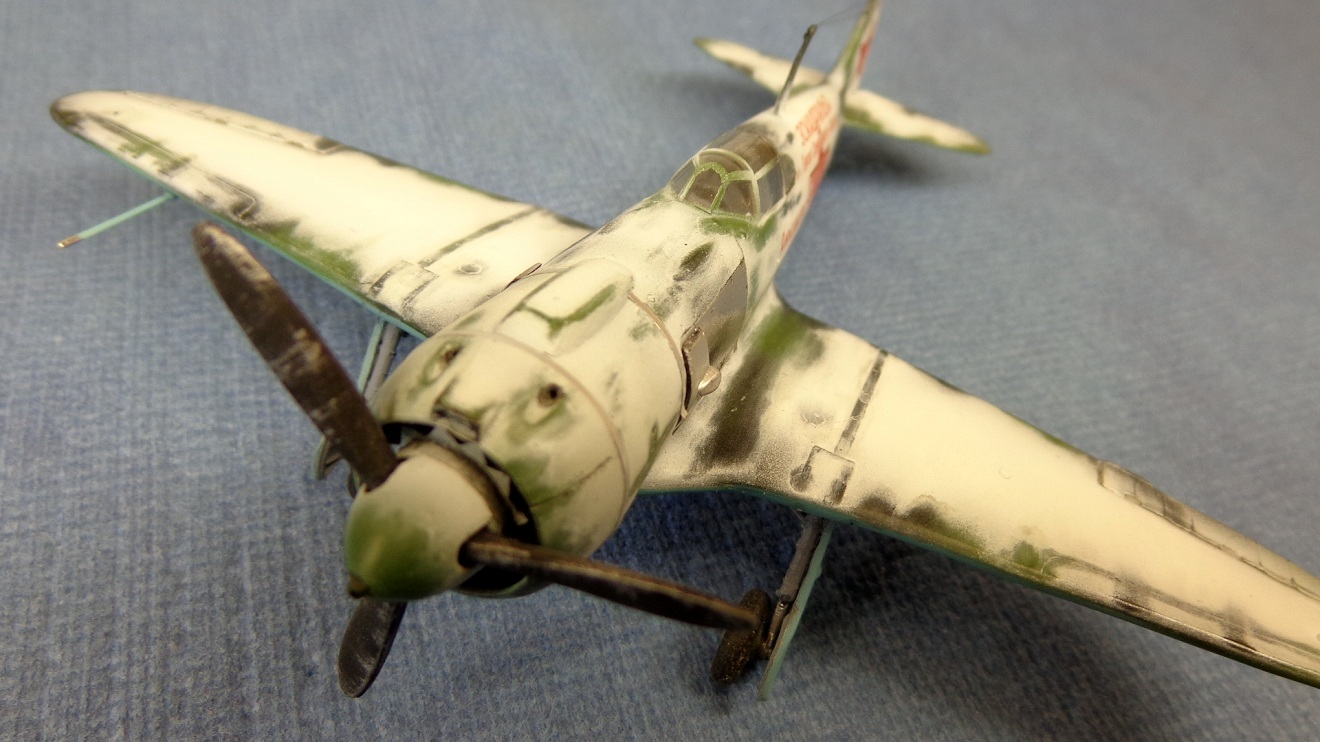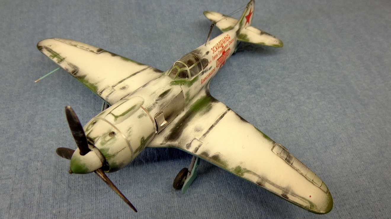 спиртом не растворяется. Макаете ватную палочку в ИПС и "смываете" белый акрил там, где вам надо. Все. Теперь про "низ". Во-первых, если фото "верхов" мы видим очень часто, то как выглядят нижние поверхности я не знаю, поэтому и не заостряю на этом свое внимание. Во-вторых, фронтовое фото датируется февралем 1943 года. Самолеты Ла-5 только-только поступают в войска, и если сверху легкосмываемую зимнюю краску успели обтереть рукавицами, валенками, бушлатами, то снизу то что, ну может подтекает где-то гидравлика. Ладно, я нарисую эти потеки.