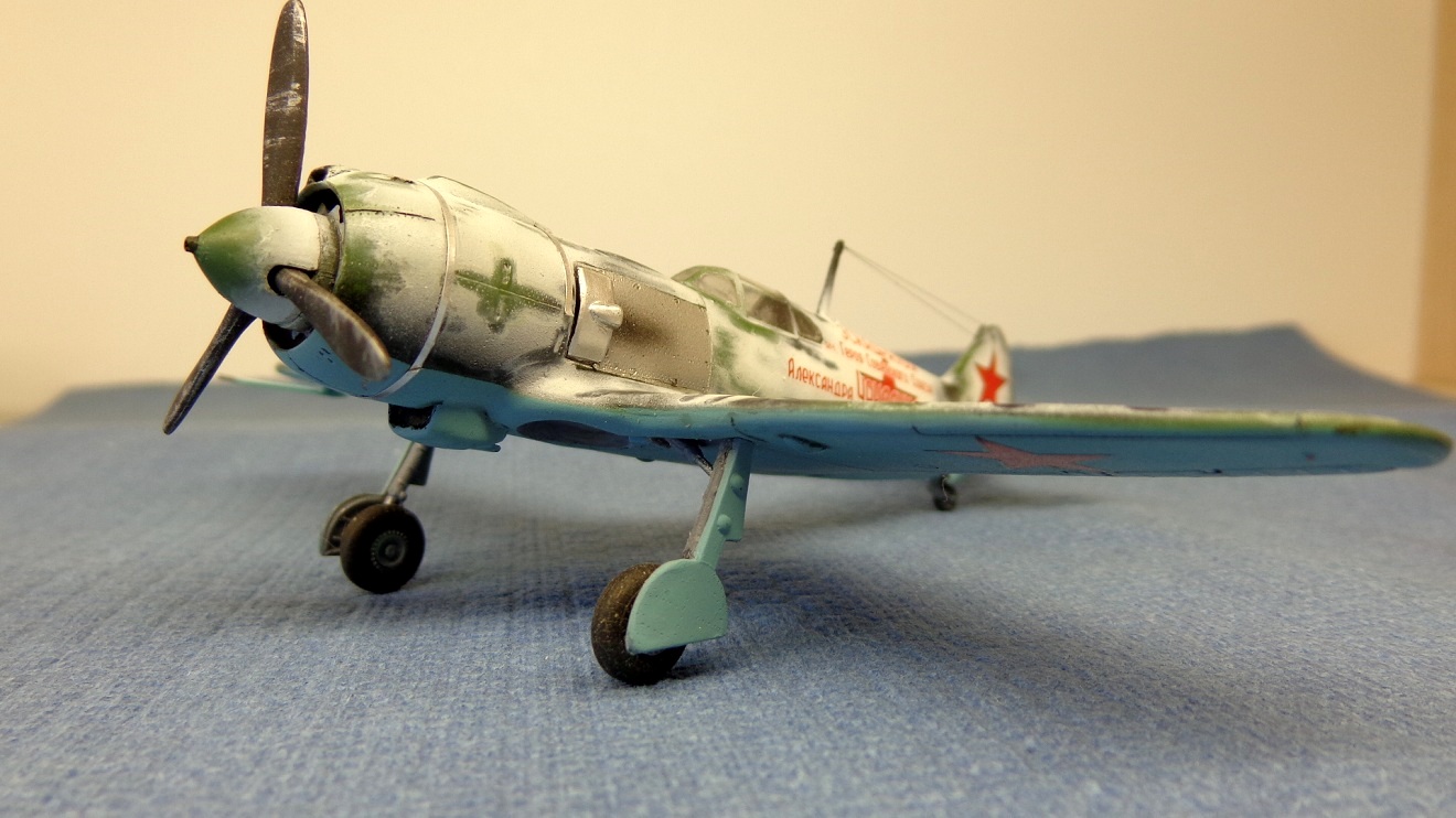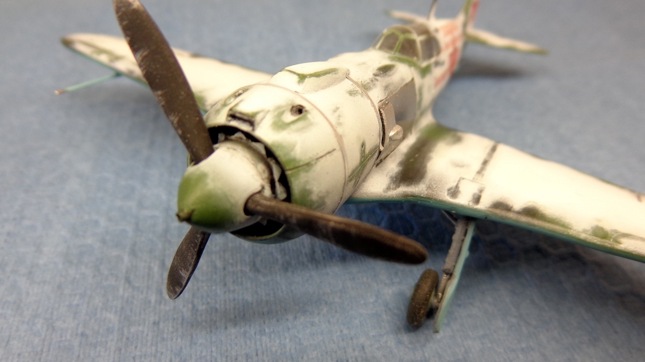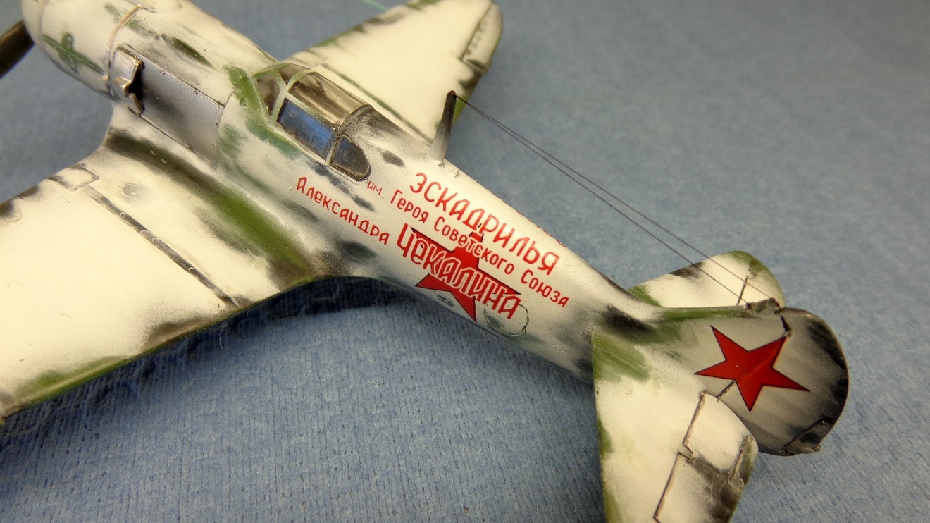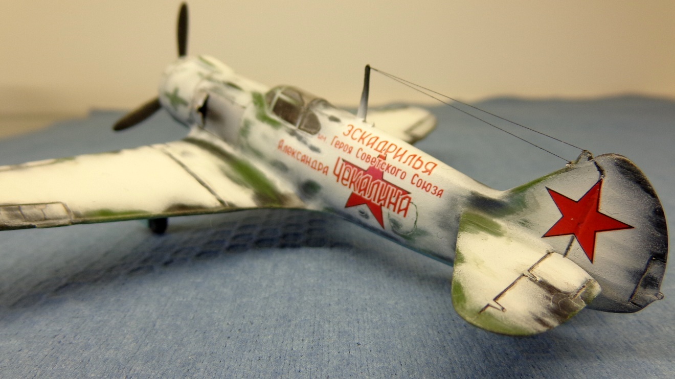 спиртом не растворяется. Макаете ватную палочку в ИПС и "смываете" белый акрил там, где вам надо. Все. Теперь про "низ". Во-первых, если фото "верхов" мы видим очень часто, то как выглядят нижние поверхности я не знаю, поэтому и не заостряю на этом свое внимание. Во-вторых, фронтовое фото датируется февралем 1943 года. Самолеты Ла-5 только-только поступают в войска, и если сверху легкосмываемую зимнюю краску успели обтереть рукавицами, валенками, бушлатами, то снизу то что, ну может подтекает где-то гидравлика. Ладно, я нарисую эти потеки.