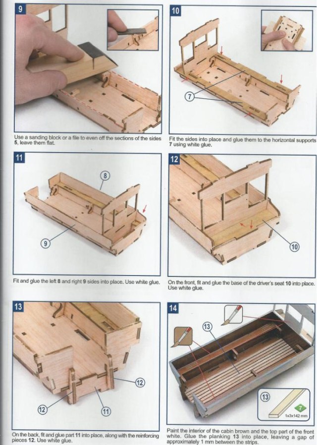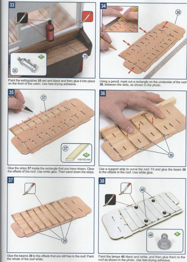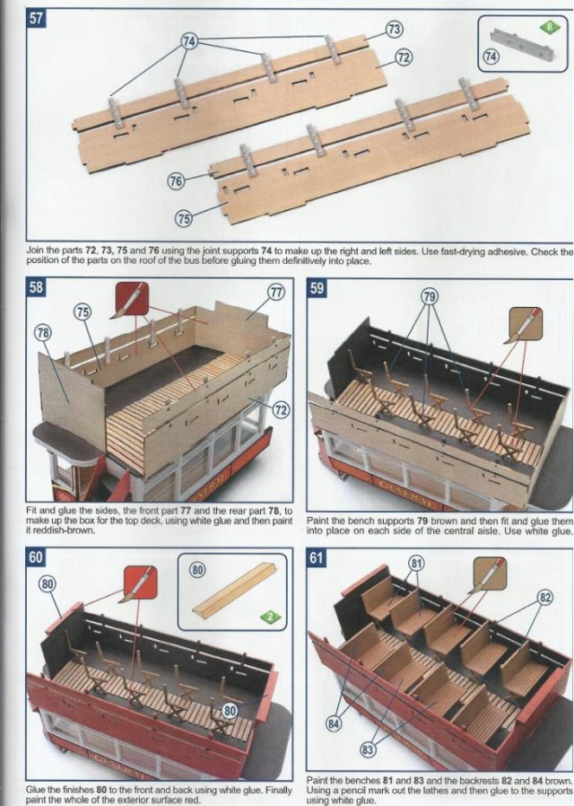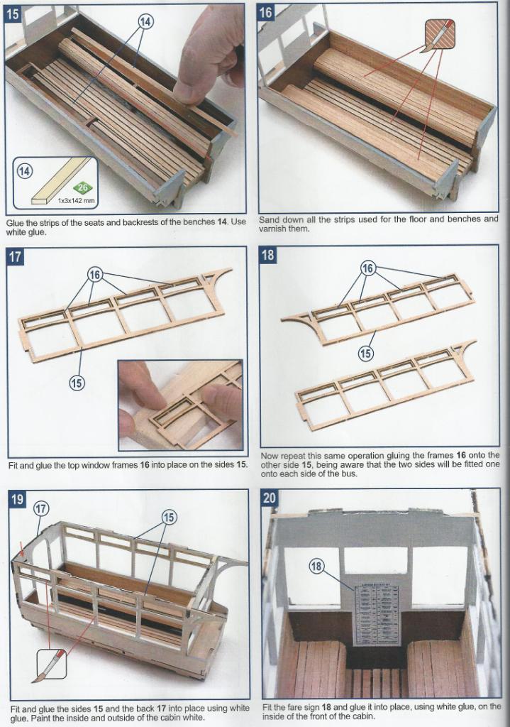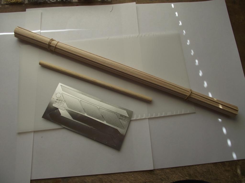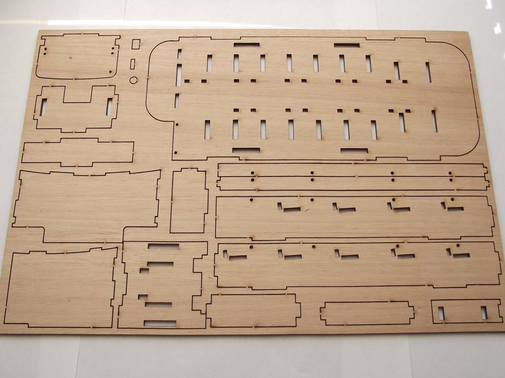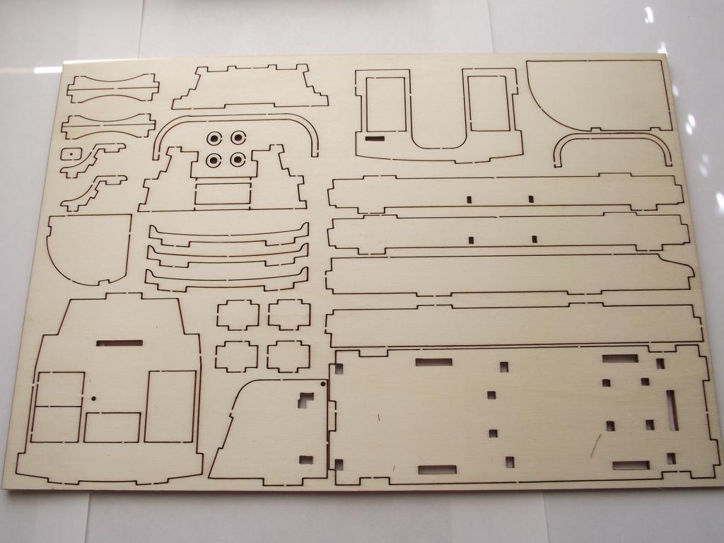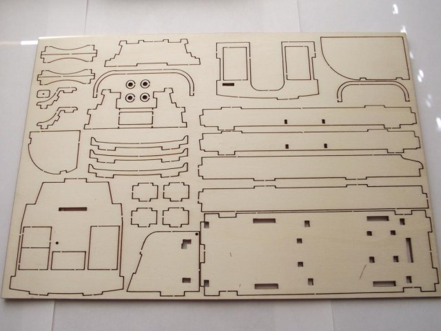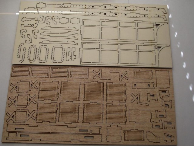 Деревянные детали модели вырезаны лазером в четырех листах шпона. Лист прозрачного пластика для остекления и кусок жести с вырезанными лазером деталями ограждения лестницы и пр. Пучок полосок шпона для настила пола и изготовления скамеек.