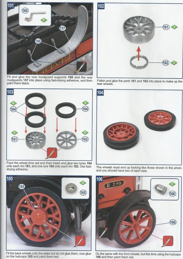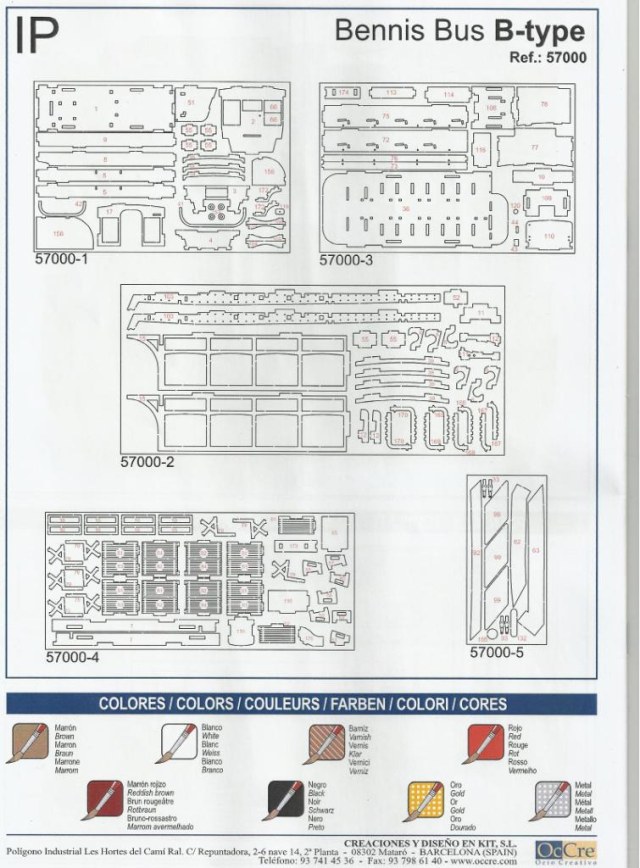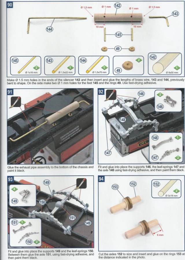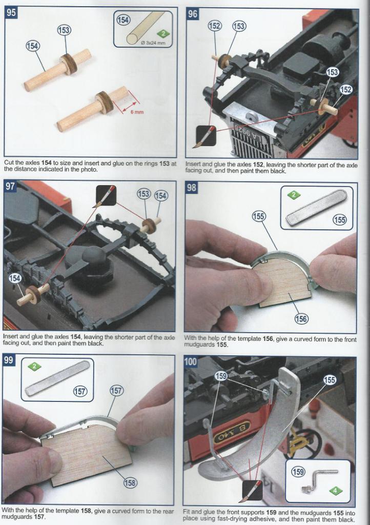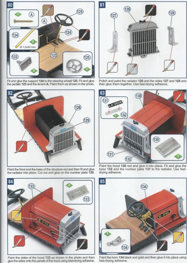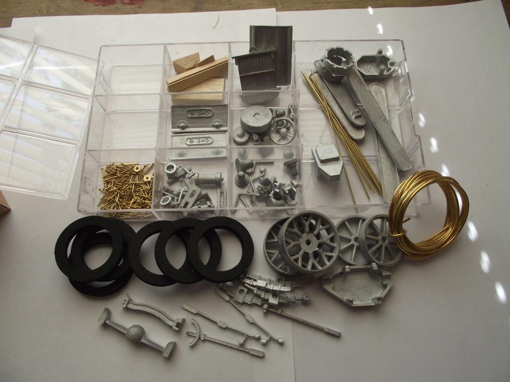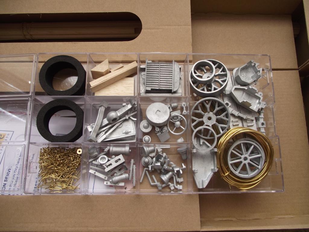 В прозрачную коробку (с перегородками) сложены литые из легкого сплава детали подвески, колес, облицовки, рычаги, руль и прочая мелочь. Так же имеется моток латунной проволоки и латунные стержни, шины из микропористой резины, гвоздики с декоративными шляпками и небольшие брусочки дерева. Литьё, конечно-же, придется хорошенько обрабатывать.