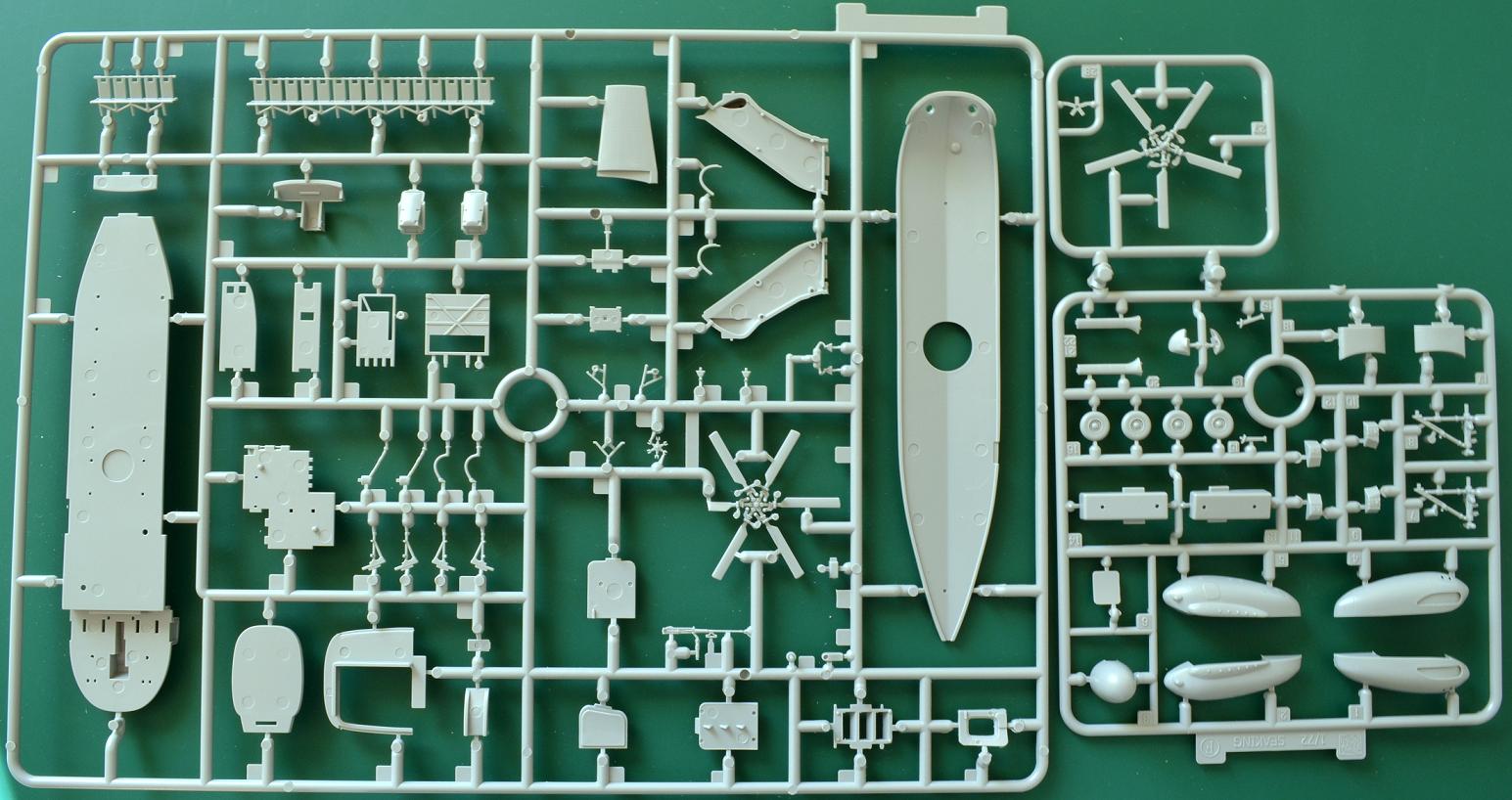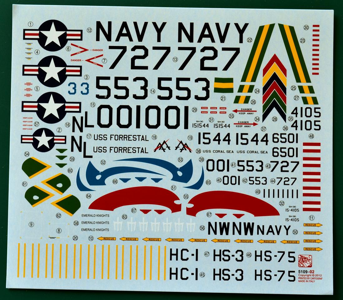 Все детали также, как и на английской версии отлиты превосходно с тонким внутренним расшивом и аккуратной клепкой (где это необходимо). Такая же качество и у прозрачных деталей остекления. На прекрасно отпечатанном красочном листе декали варианты на три борта американских ВМС с двух авианосцев FORRESTAL и CORAL SEA. Инструкция по сборке поможет без труда собрать эту превосходную модель. Даже просто "из коробки". А тем, кто хочет сделать точную копию нужно немного потрудиться-)). В завершение к вышесказанному добавлю, что данный кит (ИМХО) самый лучший для этой модификации "морского короля". А с появлением дополнений к этой модели (это неизбежно) можно сделать очень точную модель.
