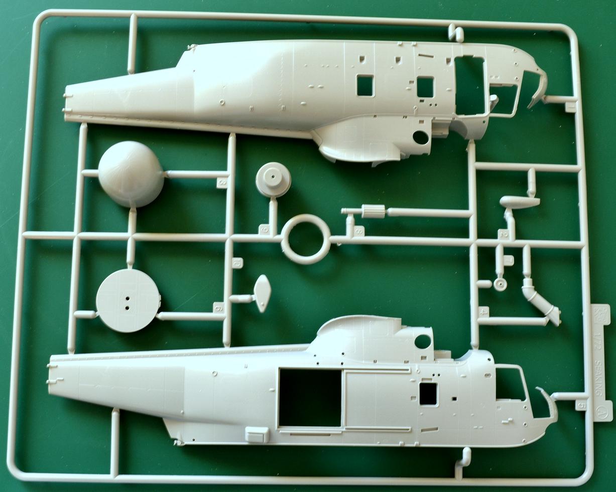 В не менее красочной картонной коробке (почему-то очень плотно закрытой) лежало такое же количество полистирольных рамок 4 крупных и одна с капотами. Правда, с некоторыми изменениями для данной модификации. Также рамка с прозрачными деталями остекления и светотехники. Лист декали с инструкцией на 3 варианта окраски данного вертолета.