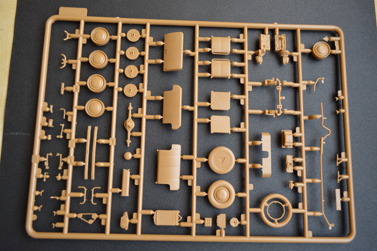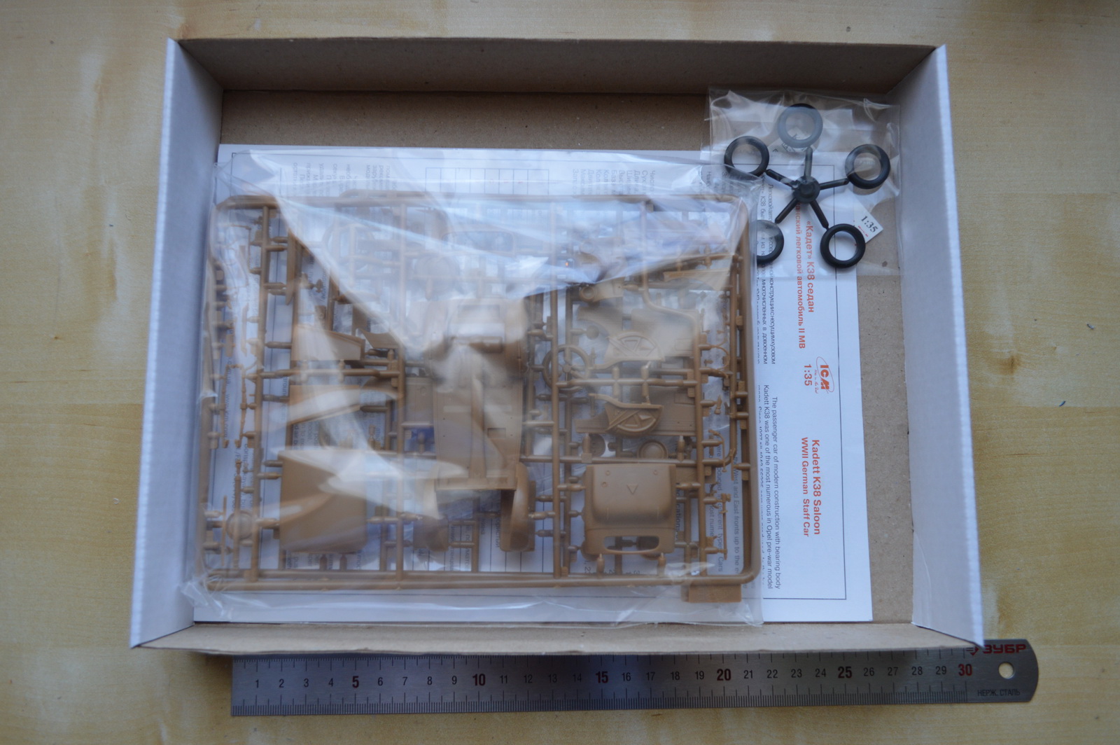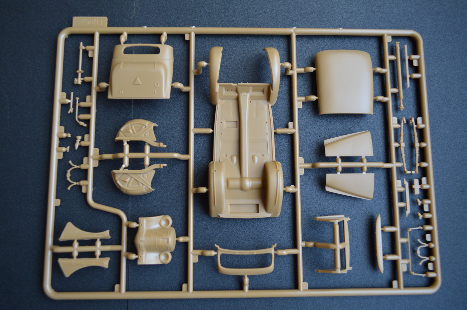 В коробке нас оожидает три литника с деталями автомобиля, литник с прозрачными деталями и колеса из резиноподобного материала.
