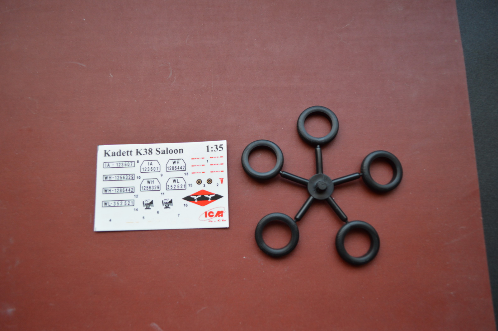 Декаль в наборе четыре варианта. Удалось нагуглить два варианта ,которые предлагает ICM. Гражданский автомобиль черного цвета и машину в зимнем окрасе за 1942г. в России.