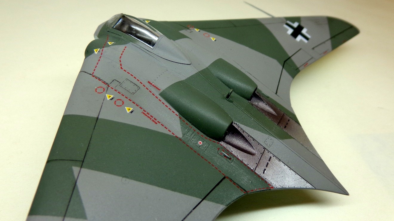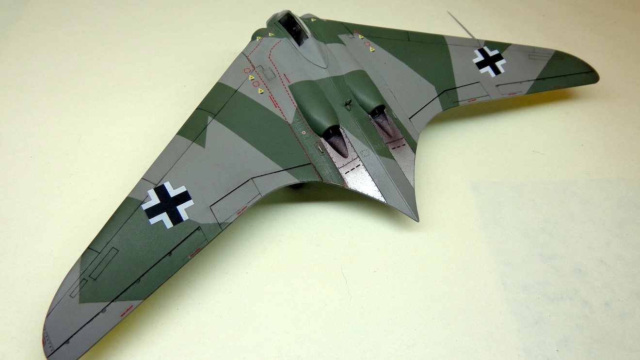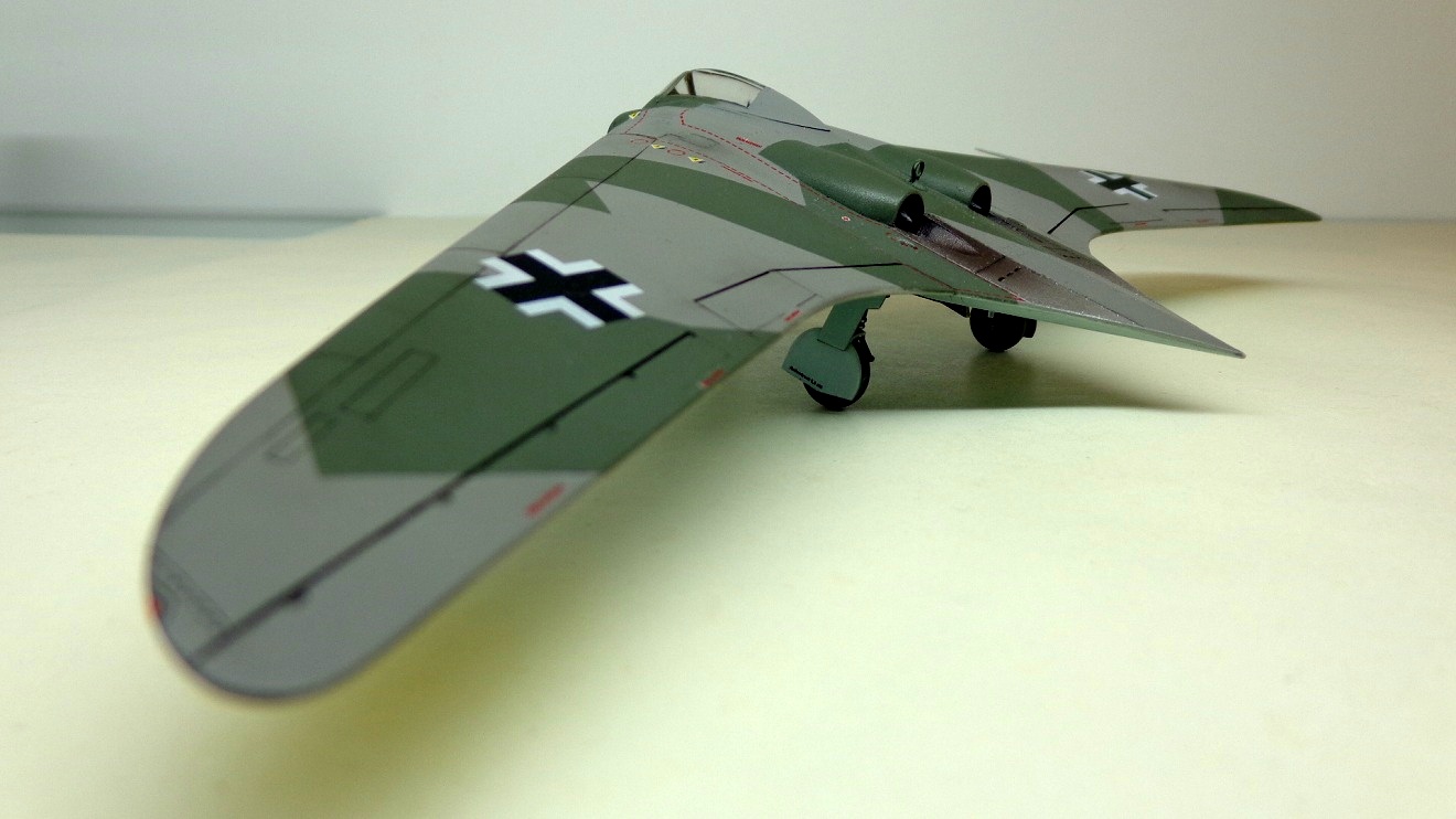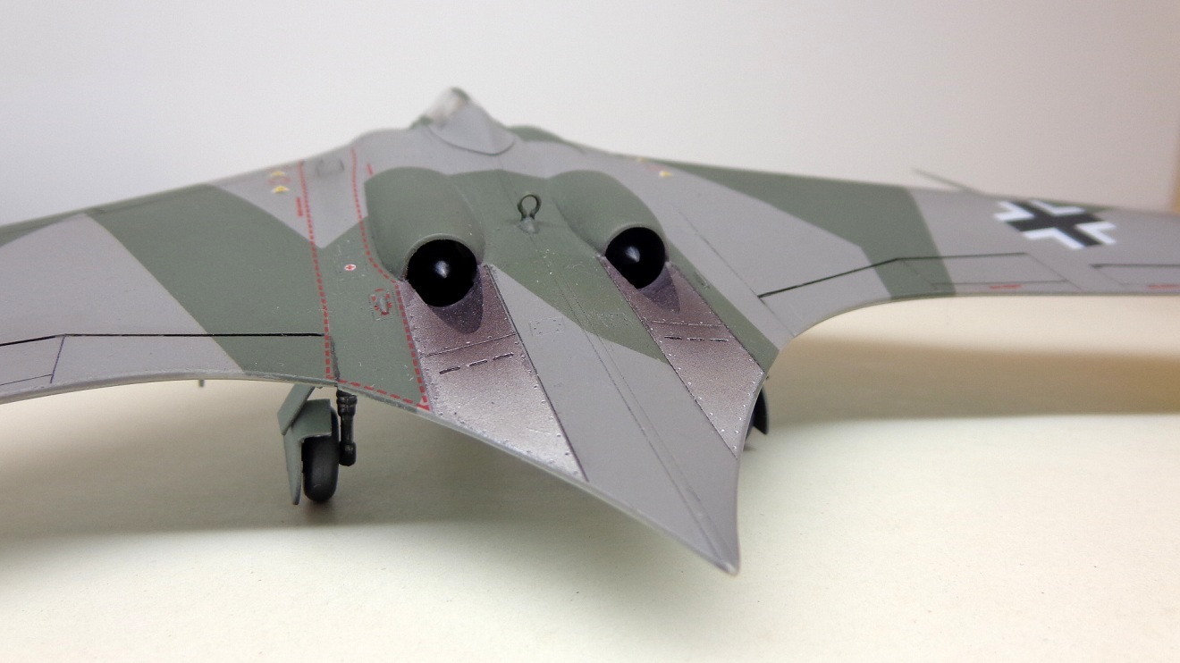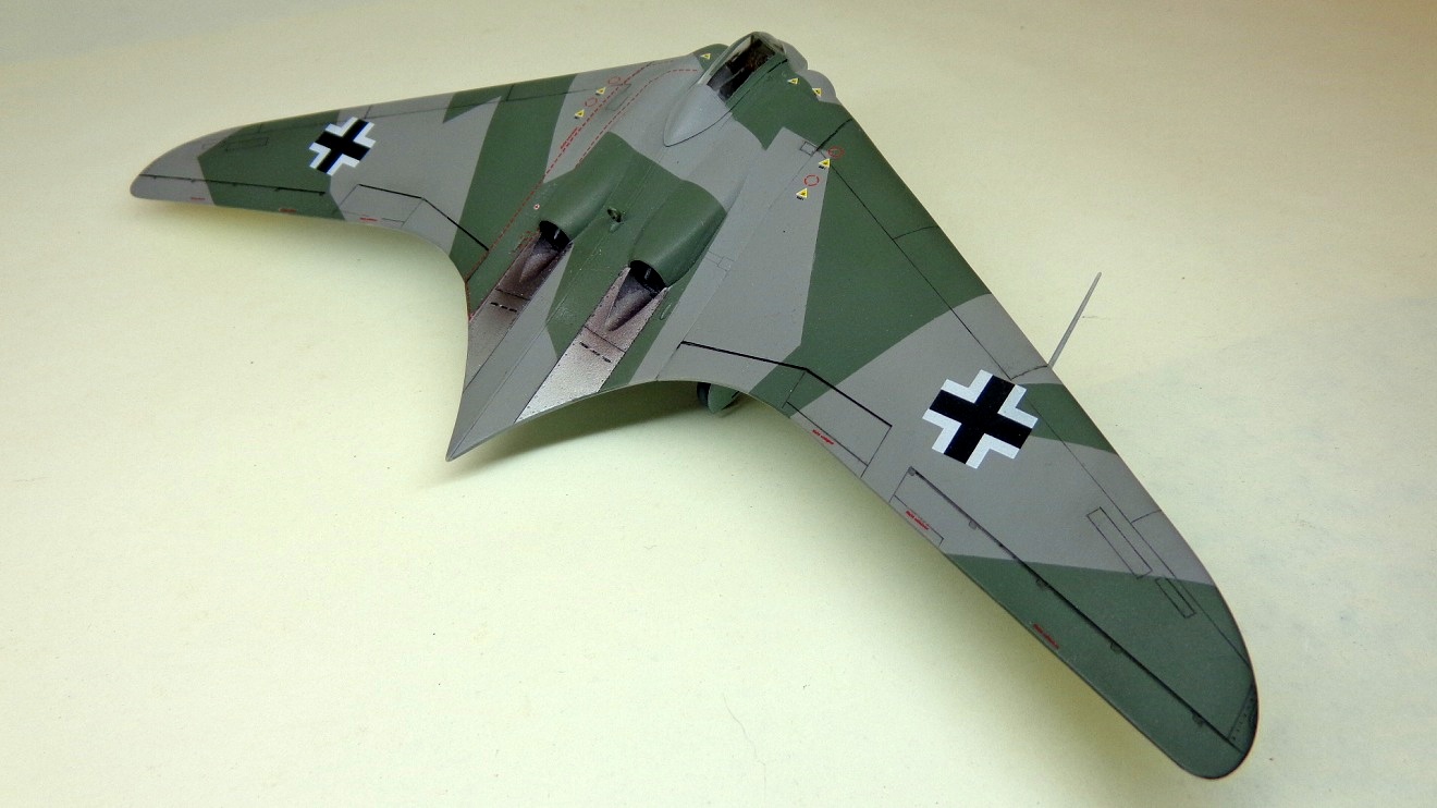 Сказочный самолет братьев Вальтера и Реймара Хортенов. Даже сейчас, спустя семьдесят лет, этот летательный аппарат будоражит наше воображение. Скорость почти 1000 км/час, потолок более 15 км. И это в 1945 году! Какой же моделист не заинтересуется этим фантастическим самолетом. Модель от "REVELL" проста и легка в сборке. В данном случае окрашена мной акрилом "АКАН" сверху и голубой и желтой "Звездой-супер" снизу. Смывка - черная гуашь с "фейри". Нагар - это "жженый метал" от "АКАН", который кстати плохо растворяется и быстро забивает аэрограф. Погнавшись за эффектным ломаным немецким камуфляжем(в соответствии с инструкцией производителя) я отошел от реального облика прототипа, о чем сейчас начинаю сожалеть. Внутрь вклеены довольно "живописные" пушки, которые правда совершенно не видны. А вот дульные тормоза пушек(больше похожие на лопаты) не приклеил, также не использовал декали с бортовыми номерами и эмблемами, так как и то и другое не существовало. Большие опасения вызывала декаль с "дорожкой" к кабине с большой прозрачной поверхностью. Но не "засеребрилась", лака в этом месте положил достаточно.