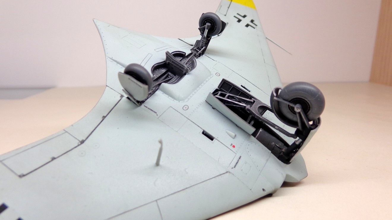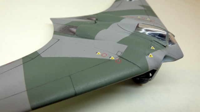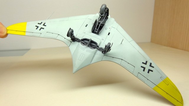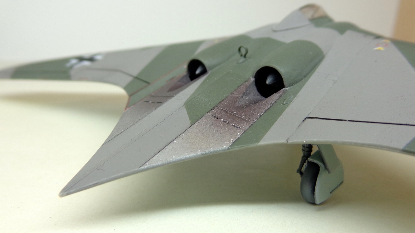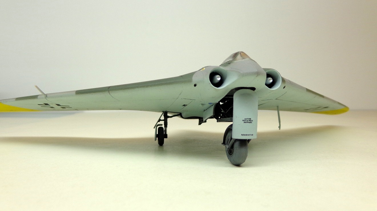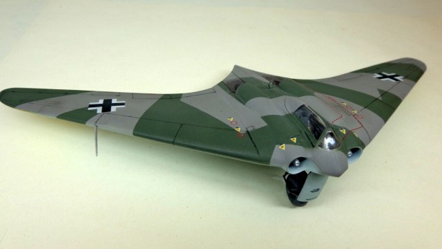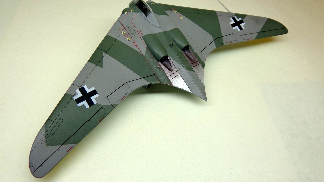 Сказочный самолет братьев Вальтера и Реймара Хортенов. Даже сейчас, спустя семьдесят лет, этот летательный аппарат будоражит наше воображение. Скорость почти 1000 км/час, потолок более 15 км. И это в 1945 году! Какой же моделист не заинтересуется этим фантастическим самолетом. Модель от "REVELL" проста и легка в сборке. В данном случае окрашена мной акрилом "АКАН" сверху и голубой и желтой "Звездой-супер" снизу. Смывка - черная гуашь с "фейри". Нагар - это "жженый метал" от "АКАН", который кстати плохо растворяется и быстро забивает аэрограф. Погнавшись за эффектным ломаным немецким камуфляжем(в соответствии с инструкцией производителя) я отошел от реального облика прототипа, о чем сейчас начинаю сожалеть. Внутрь вклеены довольно "живописные" пушки, которые правда совершенно не видны. А вот дульные тормоза пушек(больше похожие на лопаты) не приклеил, также не использовал декали с бортовыми номерами и эмблемами, так как и то и другое не существовало. Большие опасения вызывала декаль с "дорожкой" к кабине с большой прозрачной поверхностью. Но не "засеребрилась", лака в этом месте положил достаточно.